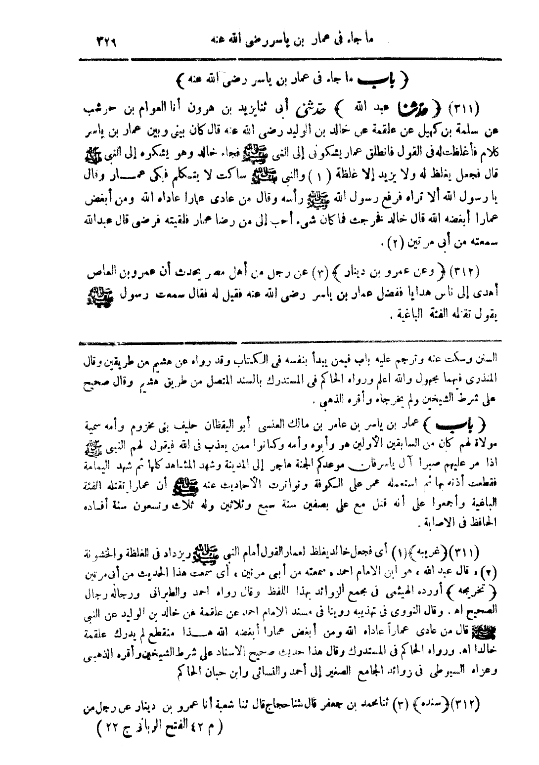 (312) (وعن عمرو بن دينار) عن رجل من أهل مصر يحدث أن عمرو بن العاص أهدى إلى ناس هدايا ففضل عمار بن ياسر رضي الله عنه فقيل له فقالت سمعت رسول صلى الله عليه وسلم يقول تقتله الفئة الباغية.