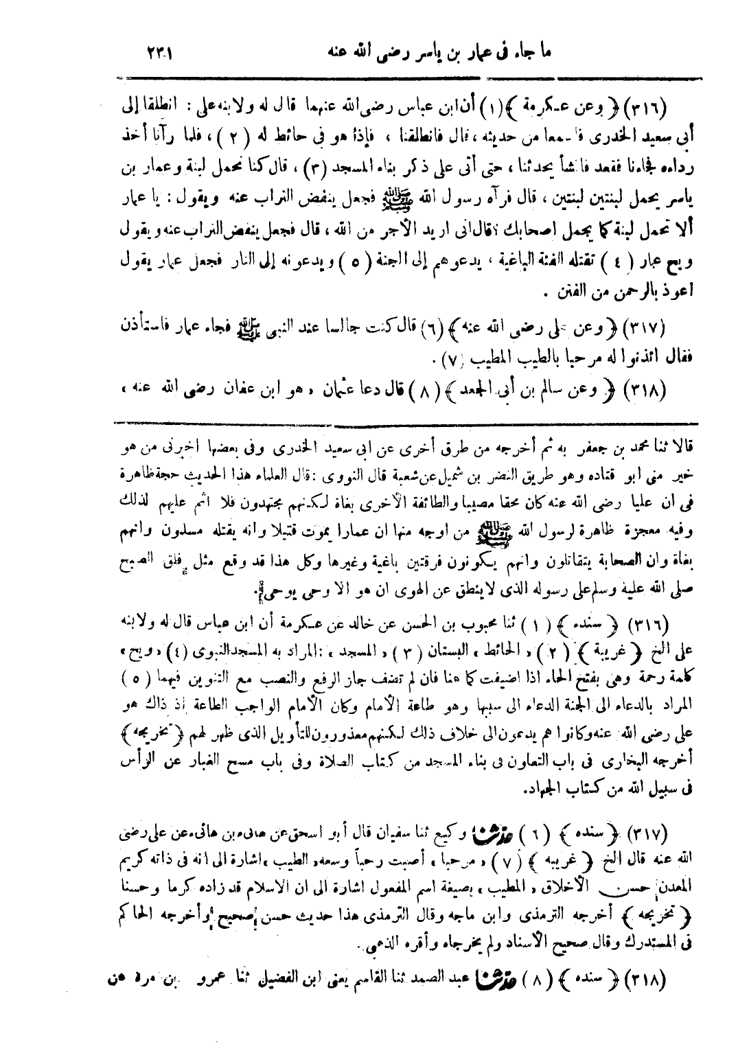 (316) (سنده) (1) ثنا محبوب بن الحسن عن خالد عن عكرمة أن ابن عباس قال له ولابنه على الخ (غريبة) (2) "الحائط" البستان (3) "المسجد": المراد به المسجد النبوى (4) "ويح" كلمة رحمة وهى بفتح الحاء اذا اضيفت كما هنا فان لم تضف جاز الرفع والنصب مع التنوين فيهما (5) المراد بالدعاء الى الجنة الدعاء الى سببها وهو طاعة الأمام وكان الأمام الواجب الطاعة اذ ذاك هو على رضى الله عنه وكانوا هم يدعون الى خلاف ذلك لكنهم معذورون للتأويل الذى ظهر لهم (تخريجه) أخرجه البخارى فى باب التعاون فى بناء المسجد من كتاب الصلاة وفى باب مسح الغبار عن الرأس فى سبيل الله من كتاب الجهاد.