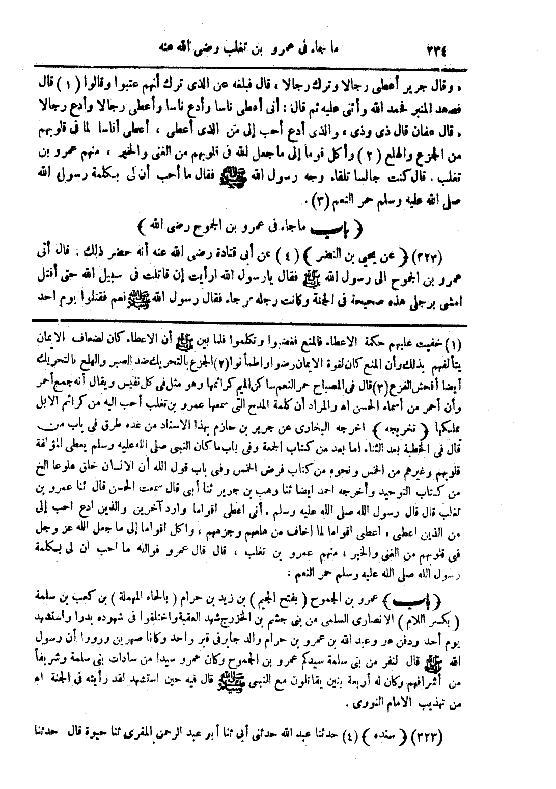 (باب) عمرو بن الجموح (بفتح الجيم) بن زيد بن حرام (بالحاء المهملة) بن كعب بن سلمة (بكسر اللام) الانصارى السلمى من بنى جشم بن الخزرج شهد العقبة واختلقوا فى شهوده بدرا واستشهد يوم أحد ودفن هو وعبد الله بن عمرو بن حرام والد جابر فى قبر واحد وكانا صهرين ورووا أن رسول الله صلى الله عليه وسلم قال لنفر من بنى سلمة سيدكم عمرو بن الجموح وكان عمرو سيدا من سادات بنى سلمة وشريفاً من أشرافهم وكان له أربعة بنين يقاتلون مع النبى صلى الله عليه وسلم قال فيه حين استشهد لقد رأيته فى الجنة اهـ من تهذيب الامام النووى.