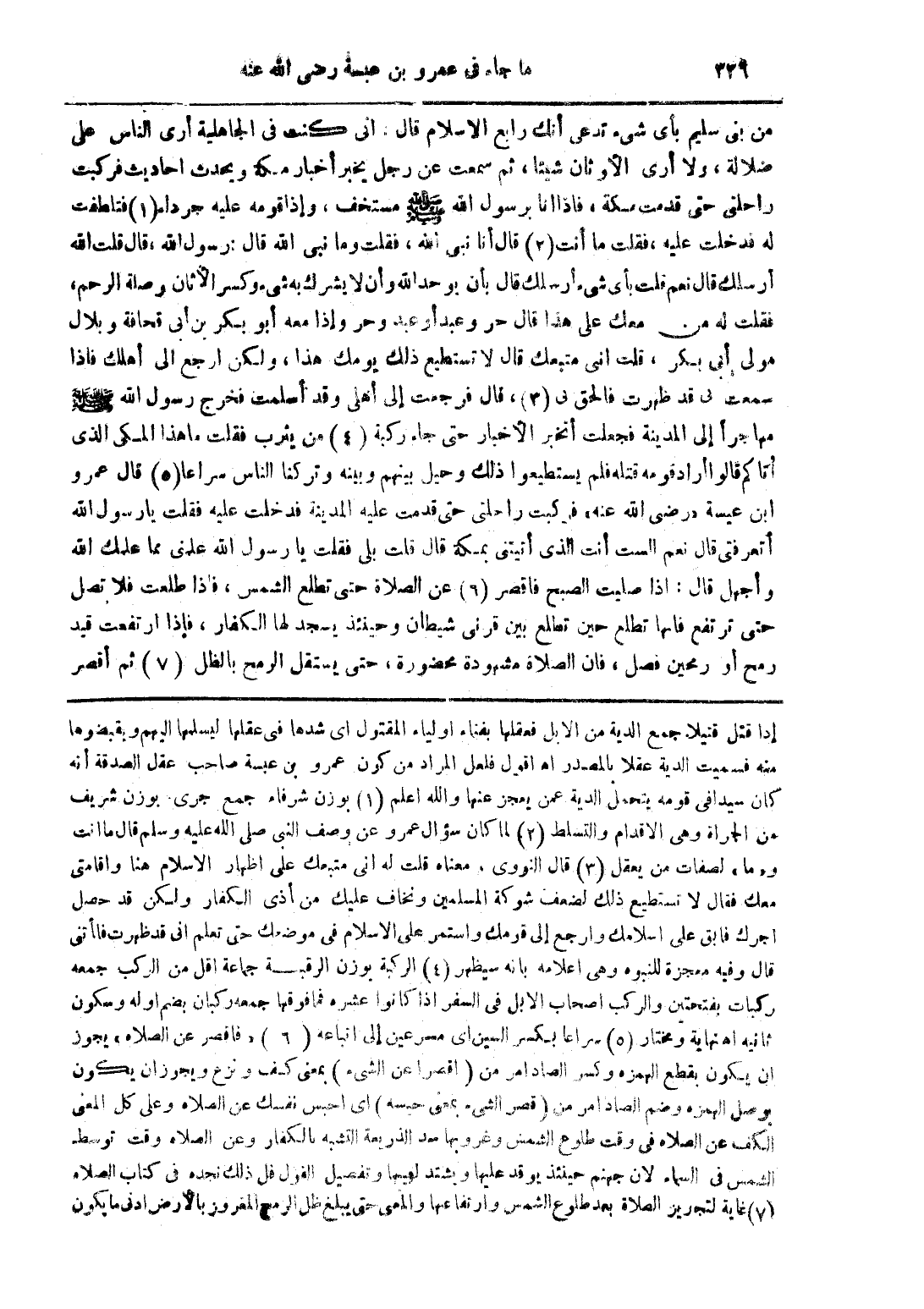 إذا قتل قتيلا جمع الدية من الإبل فعلقها بفناء أولياء المقتول أي شدها في عقلها ليسلمها إليهم ويقبضوها منه فسميت الدية عقلا بالمصدر اهـ أقول فلعل المراد من كون عمرو بن عبسة صاحب عقل الصدقة أنه كان سيدافي قومه يتحمل الدية عمن يعجز عنها والله أعلم (1) بوزن شرفاء جمع جرى. بوزن شريف عن الجراة وهي الاقدام والتسلط (2) لما كان سؤال عمرو عن وصف النبي صلى الله عليه وسلم قال ما أنت و"ما" لصفات من يعقل (3) قال النووي. معناه قلت له أني متبعك على إظهار الإسلام هنا وإقامتي معك فقال لا تستطيع ذلك لضعف شوكة المسلمين ونخاف عليك من أذى الكفار ولكن قد حصل أجرك فايق على إسلامك وأرجع إلى قومك واستمر على الإسلام في موضعك حتى تعلم أني قد ظهرت فأنني قال وفيه معجزة للنبوة وهي أعلامه بأنه سيظهر (4) الركبة بوزن الرقبة جماعة أقل من الركب جمعه ركبات بفتحتين والركب أصحاب الإبل في السفر إذا كانوا عشره فما فوقها جمعة ركبان بضم أوله ومكون ثانية اهـ نهاية ومختار (5) سراعا بكسر السين أي مسرعين إلى انباعه (6) "فاقصر عن الصلاة" يجوز أن يكون بقطع الهمزة وكسر الصاد أمر من (اقصرا عن الشيء) بمعنى كف ونزع ويجوز أن يكون يوصل الهمزة وضم الصاد أمر من (قصر الشيء بمعنى حبسه) أي أحبس نفسك عن الصلاة وعلى كل المعنى الكف عن الصلاة في وقت طلوع الشمس وغروبها سد الذريعة التشبه بالكفار وعن الصلاة وقت توسط الشمس في السماء لأن جهنم حينئذ يوقد عليها ويشتد لهيبها وتفصيل الفول فل ذلك نجده في كتاب الصلاة (7) غاية لتجويز الصلاة بعد طلوع الشمس وارتفاعها والمعنى حتيى يبلغ ظل الرمح المغروز بالأرض أدنى ما يكون