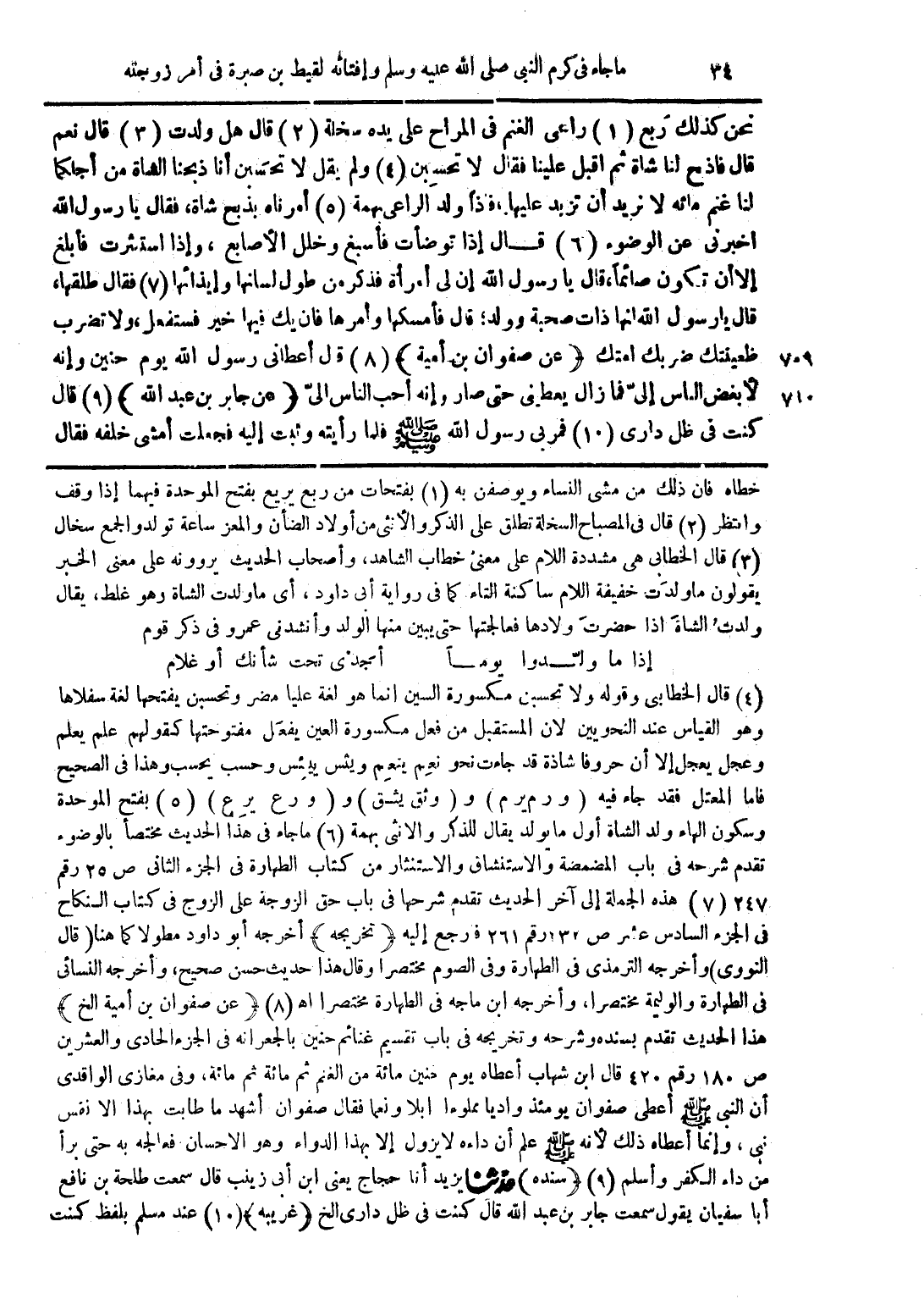 نحن كذلك ربع راعي الغنم في المراح على يده سخلة قال هل ولدت قال نعم قال فاذبح لنا شاة ثم أقبل علينا فقال لا تحسبن ولم يقل لا تحسبن أنا ذبحنا الشاة من أجلكما لنا غنم مائة لا نريد أن تزيد عليها، فإذا ولد الراعي بهمة أمرناه بذبح شاة، فقال يا رسول الله أخبرني عن الوضوء قال إذا توضأت فأسبغ وخلل الأصابع، وإذا استشرت فأبلغ إلا أن تكون صائمًا، قال يا رسول الله إن لي أمرأة فذكر من طول لسانها وإيذائها فقال طلقها، قال يا رسول الله إنها ذات صحبة وولد؛ قال فأمسكها وأمرها فإن يك فيها خير فستفعل، ولا تضرب ظعينتك ضربك أمتك (عن صفوان بن أمية) قال أعطاني رسول الله يوم حنين وإنه لأبغض الباس إلىّ فما زال يعطيني حتى صار وإنه أحب الناس إلىّ (عن جابر بن عبد الله) قال كنت في ظل داري فمربى رسول الله صلى الله عليه وسلم فلما رأيته وثبت إليه فجعلت أمشى خلفه فقال