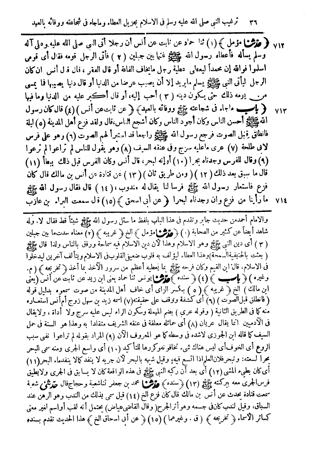 والإمام أحمد من حديث جابر وتقدم في هذا الباب بلفظ ما سئل رسول الله صلى الله عليه وسلم شيئًا قط فقال لا، وله شاهد أيضًا عن كثير من الصحابة (1) (حدثنا مؤمل) الخ (غريبه) (2) معناه سدت ما بين جبلين (3) أي دين النبي صلى الله عليه وسلم وهو الإسلام وهذا لأن دين الإسلام فيه سماحة ورفق بالناس ولذا قال صلى الله عليه وسلم (بعثت بالحنيفية السمحة) وهذا العطاء ليؤلف به قلوب ضعيفي القلوب في الإسلام ويتألف آخرين ليدخلوا في الإسلام، قال ابن القيم وكان فرحه صلى الله عليه وسلم بما يعطيه أعظم من سرور الآخذ بما آخذ (تخريجه) (م. وغيره) (باب) (4) (سنده) حدثنا يونس ثنا حماد يعني ابن زيد عن ثابت عن أنس (يعني ابن مالك) الخ (غريبه) (5) بكسر الزاي أي خاف أهل المدينة من صوت سمعوه بدليل قوله (فانطلق قبل الصوت) (6) أي كشفة ووقف على حقيقته (7) اسمه زيد بن سهل زوج أم أنس استعاره منه كما في الطريق الثانية (وقوله عرى) بضم المهملة وسكون الراء ليس عليه سرج ولا أداة، ولا يقال في الآدميين إنما يقال عريان (8) أي حمائله معلقة في عنقه الشريف متقلدا به وهذا هو السنة في حمل السيف كما قاله ابن الجوزي لا شده في وسطه كما هو المعروف الآن (9) المراد بقوله لم تراعوا نفي سبب الروع أي الخوف أي ليس هناك شيء تخافونه وكررها للتأكيد (10) أي واسع الجرى ومنه سمى البحر بحرا لسعته: وتبحر فلان العلم إذا اتسع فيه؛ وقيل شبهه بالبحر لأن جريه لا ينفذ كمالا ينفد ماء البحر (11) أي كان بطيء المشي (12) أي بعد أن ركبه النبي صلى الله عليه وسلم في هذه الواقعة كان لا يسابق في الجرى ولا يطيق فرس الجرى معه ببركته صلى الله عليه وسلم (13) (سنده) حدثنا محمد بن جعفر ثنا شعبة وحجاج قال حدثني شعبة سمعت قتادة يحدث عن أنس بن مالك قال كان فزع الخ (214) قيل سمى بذلك من الندب وهو الرهن عند السباق، وقيل لندب كان في جسمه وهو أثر الجرح (وقال القاضي عياض) يحتمل أنه لقب أو اسم لغير معنى كسائر الأسماء (تخريجه) (ق. وغيرهما) (15) (عن أبي إسحاق الخ) هذا الحديث تقدم بسنده