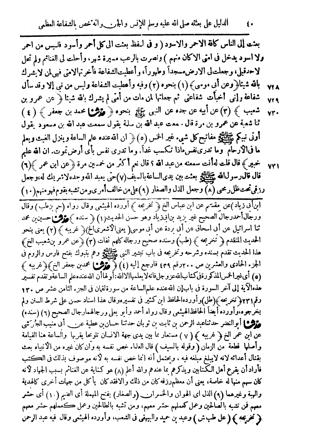 ابن أبي زياد) عن مقسم عن ابن عباس الخ (تخريجه) أورده لهيثمي وقال رواه (حم بز طب) وقال ورجال أحمد رجال الصحيح غير يزيد بن أبي زياد وهو حسن الحديث (1) (سنده) حدثنا حسين بن محمد ثنا إسرائيل عن أبي إسحاق عن أبي بردة عن أبي موسى (يعني الأشعري الخ) (غريبه) (2) يعني بنحو الحديث المتقدم (تخريجه) (طب) وسنده صحيح ورجاله كلهم ثقات (3) (عن عمرو بن شعيب الخ) هذا الحديث تقدم بسنده وشرحه وتخريجه في باب تبشير النبي صلى الله عليه وسلم وهم بتبوك بفتح فارس والروم في الجزء الحادي والعشرين ص 200 رقم 429 فارجع إليه (4) (حدثنا محمد بن جعفر الخ) (غريبه) (5) أي غير الخمس المذكورة في كتاب الله عز وجل فإنه لا يعلمها إلا الله: أولها أن الله عنده علم الساعة وتقدم تفسير هذه الآية إلى آخر السورة في باب إن الله عنده علم الساعة من سورة لقمان في الجزء الثامن عشر ص 130 رقم 231 (تخريجه) (طل) وأورده الحافظ ابن كثير في تفسيره وقال هذا إسناد حسن على شرط السنن ولم يخرجوه، وأورده أيضًا الحافظ الهيثمي وقال رواه أحمد وأبو يعلى ورجالهما رجال الصحيح (6) (سنده) حدثنا أبو النضر حدثنا عبد الرحمن بن ثابت بن ثوبان حدثنا حسان بن عطية عن أبي منيب الجرشى عن ابن عمر الخ (غريبه) (7) مستعار مما بين يدية جهة الإنسان تلويحا يقربها والساعة هنا القيامة وأصلها قطعة من الزمان (وقوله بالسيف) قال العلماء خص نفسه به وإن كان غيره من الأنبياء بعث بقنال أعدائه لأنه لا يبلغ مبلغه فيه، ويحتمل أنه إنما خص نفسه به لأنه موصوف بذلك في الكتب فأراد أن يقرع أهل الكتابين ويذكرهم بما عندهم والله أعلم (8) هو كناية عن الغنائم بسبب الجهاد لأنه كان سهم منها له خاصة، يعني أن معظم رزقه كان من ذلك والا فقد كان يأكل من جهات أخرى كالهدية والهبة وغيرهما (9) الذل أي الهوان والخسران (والصغار) بفتح المهملة أي الضيم (10) أي حشر معهم فمن تشبه بالصالحين وعمل كعملهم حشر معهم، ومن تشبه بالطالحين وعمل كعملهم حشر معهم (تخريجه) (عل طب ش) وعبد بن حميد والبيهقي في الشعب، وأورده الهيثمي وقال فيه عبد الرحمن