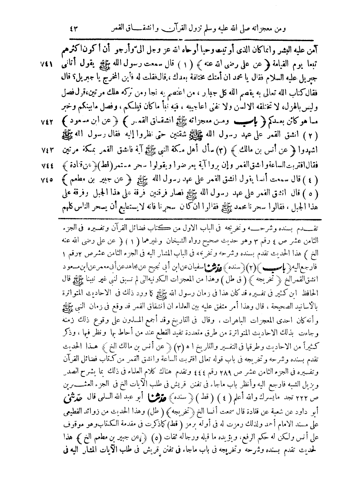 تقدم بسنده وشرحه وتخريجه في الباب الأول من كتاب فضائل القرآن وتفسيره في الجزء الثامن عشر ص 4 رقم 3 وهو حديث صحيح رواه الشيخان وغيرهما (1) (عن علي رضي الله عنه الخ) هذا الحديث تقدم بسنده وشرحه وتخريجه في الباب المشار إليه في الجزء الثامن عشر ص 2 رقم 1 فارجع إليه (باب) (2) (سنده) حدثنا سفيان عن ابن أبي نجيح عن مجاهد عن أبي معمر عن ابن مسعود انشق القمر الخ (تخريجه) (ق طل) وهذا من المعجزات الكونية التي لم تسبق لنبي غير نبينا صلى الله عليه وسلم قال الحافظ ابن كثير في تفسيره قد كان هذا في زمان رسول الله صلى الله عليه وسلم كما ورد ذلك في الاحاديث المتواترة بالأسانيد الصحيحة، قال وهذا أمر متفق عليه بين العلماء أن انشقاق القمر قد وقع في زمان النبي صلى الله عليه وسلم وأنه كان إحدى المعجزات الباهرات، وقال في التاريخ وقد أجمع المسلمون على وقوع ذلك زمنه وجاءت بذلك الأحاديث المتواترة من طرق متعددة تفيد القطع عند من أحاط بها ونظر فيها، وذكر كثيرًا من الأحاديث وطرقها في التفسير والتاريخ اهـ (3) (عن أنس بن مالك الخ) هذا الحديث تقدم بسنده وشرحه وتخريجه في باب قوله تعالى اقتربت الساعة وانشق القمر من كتاب فضائل القرآن وتفسيره في الجزء الثامن عشر ص 289 رقم 444 وتقدم هناك كلام العلماء في ذلك بما يشرح الصدر ويزيل الشبه فارجع إليه وانظر باب ما جاء في تفنن قريش في طلب الآيات الخ في الجزء العشرين ص 222 تجد ما يسرك والله أعلم (4) (قط) (سنده) حدثنا أبو عبد الله السلمي قال حدّثني أبو داود عن شعبة عن قتادة قال سمعت أنسا الخ (تخريجه) (طل) وهذا الحديث من زوائد القطيعي على مسند الإمام أحمد ولذلك رمزت له في أوله برمز (قط) كما ذكرت في مقدمة الكتاب وهو موقوف على أنس ولكن له حكم الرفع، ويؤيده ما قبله ورجاله ثقات (5) (عن جبير بن طعم الخ) هذا لحديث تقدم بسنده وشرحه وتخريجه في باب ما جاء في تفنن قريش في طلب الآيات المشار إليه في