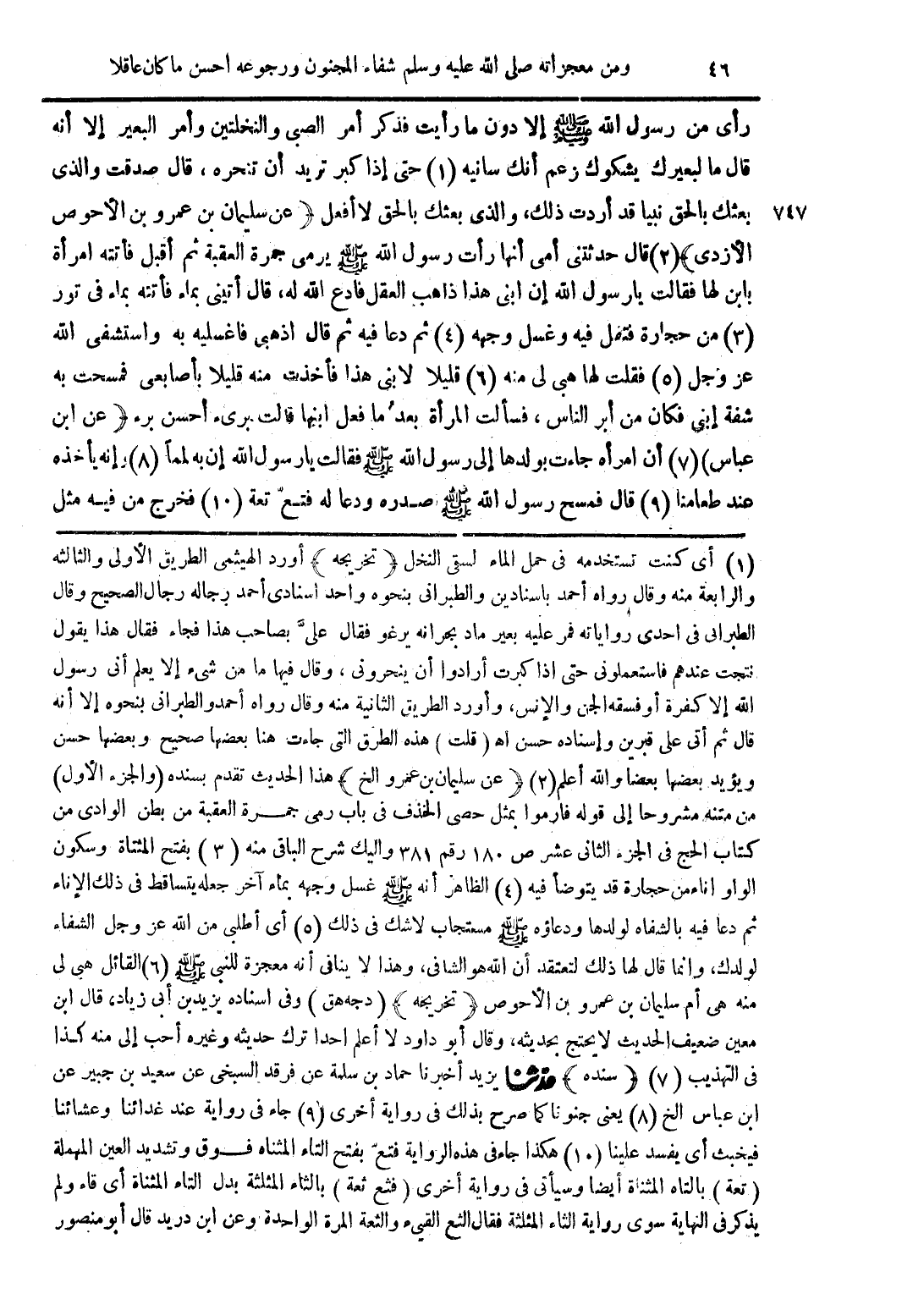 رأى من رسول الله صلى الله عليه وسلم إلا دون ما رأيت فذكر أمر الصبي والنخلتين وأمر البعير إلا أنه قال ما لبعيرك يشكوك زعم إنك سانيه حتى إذا كبر تريد أن تنحره، قال صدقت والذي بعثك بالحق نبيا قد أردت ذلك، والذي بعثك بالحق لا أفعل (عن سليمان بن عمرو بن الأحوص الأزدى) قال حدثني أمي أنها رأت رسول الله صلى الله عليه وسلم يرمى جمرة العقبة ثم أقبل فأتته امرأة بابن لها فقالت يا رسول الله إن ابني هذا ذاهب العقل فادع الله له، قال أتيني بماء فأتته بماء في تور من حجارة فتقل فيه وغسل وجهه ثم دعا فيه ثم قال اذهبي فاغسليه به واستشفى الله عز وجل فقلت لها هي لي منه قليلا لابني هذا فأخذت منه قليلا بأصابعي فمسحت به شفة إبني فكان من أبر الناس، فسألت المرأة بعد ما فعل ابنها قالت برئ أحسن برء (عن ابن عباس) أن امرأة جاءت بولدها إلى رسول الله صلى الله عليه وسلم فقالت يا رسول الله إن به لممًا إنه يأخذه عند طعامنا قال فسمح رسول الله صلى الله عليه وسلم صدره ودعا له فتعّ تعة فخرج من فيه مثل