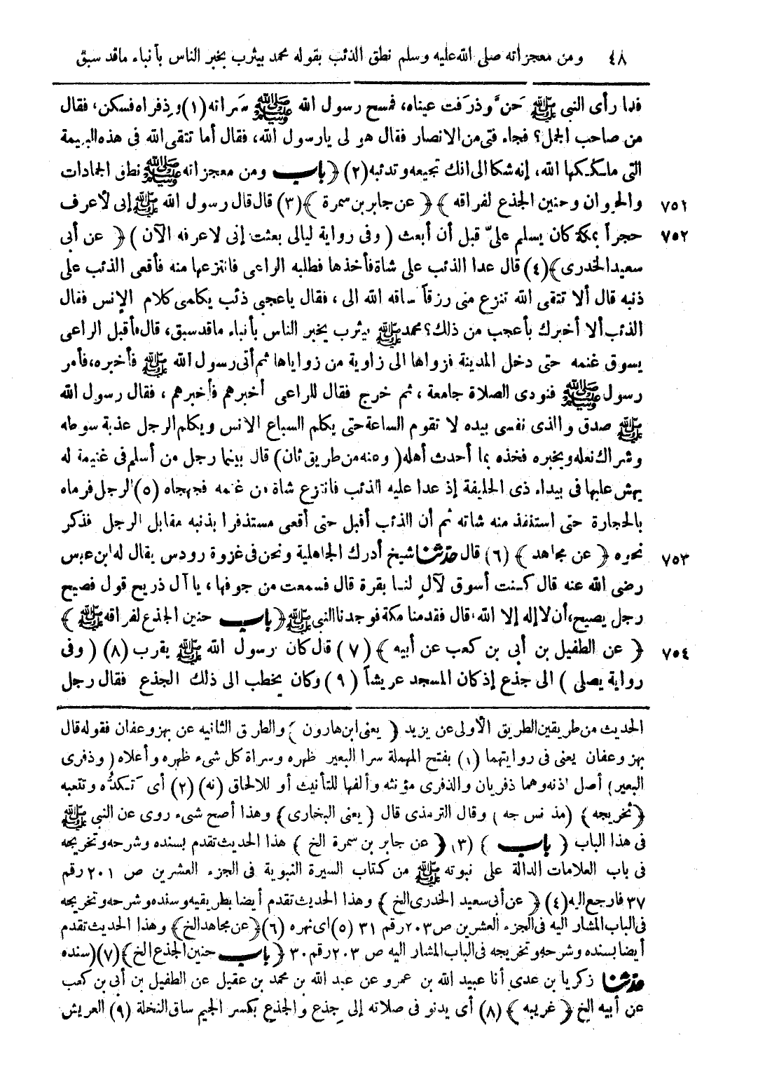 فلما رأى النبي صلى الله عليه وسلم حنَّ وذرفت عيناه، فمسح رسول الله صلى الله عليه وسلم سرانه وذفراه فسكن، فقال من صاحب الجمل؟ فجاء فتى من الأنصار فقال هو لي يا رسول الله، فقال أما تتقى الله في هذه البريمة التي ملككها الله، إنه شكا إلى أنك تجيعه وتدئبه (باب ومن معجزاته صلى الله عليه وسلم نطق الجمادات والحيوان وحنين الجذع لفراقه) (عن جابر بن سمرة) قال قال رسول الله صلى الله عليه وسلم إني لأعرف حجرًا بمكة كان يسلم علىّ قبل أن أبعث (وفي رواية ليالي بعثت إني لا عرفة الآن) (عن أبي سعيد الخدري) قال عدا الذئب على شاة فأخذها فطلبه الراعي فانتزعها منه فأقعى الذئب على ذنبه قال ألا تتقى الله تنزع منى رزقًا ساقه الله إلى، فقال يا عجبي ذئب يكلمي كلام الإنس فقال الذئب ألا أخبرك بأعجب من ذلك؟ محمد صلى الله عليه وسلم يثرب يخبر الناس بأنباء ما قد سبق، قال مأقبل الراعي يسوق غنمه حتى دخل المدينة فزواها إلى زاوية من زواياها ثم أتى رسول الله صلى الله عليه وسلم فأخبره، فأمر رسول الله صلى الله عليه وسلم فنودى الصلاة جامعة، ثم خرج فقال للراعي أخبرهم فأخبرهم، فقال رسول الله صلى الله عليه وسلم صدق والذي نفسي بيده لا تقوم الساعة حتى يكلم السباع الأنس ويكلم الرجل عذبة سوطه وشراك نعله ويخبره فخذه بما أحدث أهله (وعنه من طريق ثان) قال بينما رجل من أسلم في غنيمة له يهش عليها في بيداء ذي الخليفة إذ عدا عليه الذئب فانتزع شاة من غنمه فجهجاه الرجل فرماه بالحجارة حتى استنفذ منه شاته ثم أن الذئب أقبل حتى أقعى مستذفرا بذنبه مقابل الرجل فذكر نحوه (عن مجاهد) قال حدثنا شيخ أدرك الجاهلية ونحن في غزوة دروس يقال له ابن عبس رضي الله عنه قال كنت أسوق لآل لنا بقرة قال فسمعت من جوفها، يا آل ذريح قول فصيح رجل يصيح، أن لا إله إلا الله قال فقدمنا مكة فوجدنا النبي صلى الله عليه وسلم (باب حنين الجذع لفراقه صلى الله عليه وسلم) (عن الطفيل بن أبي بن كعب عن أبيه) قال كان رسول الله صلى الله عليه وسلم يقرب (وفي رواية) إلى جذع إذ كان المسجد عريشًا وكان يخطب إلى ذلك الجذع فقال رجل
