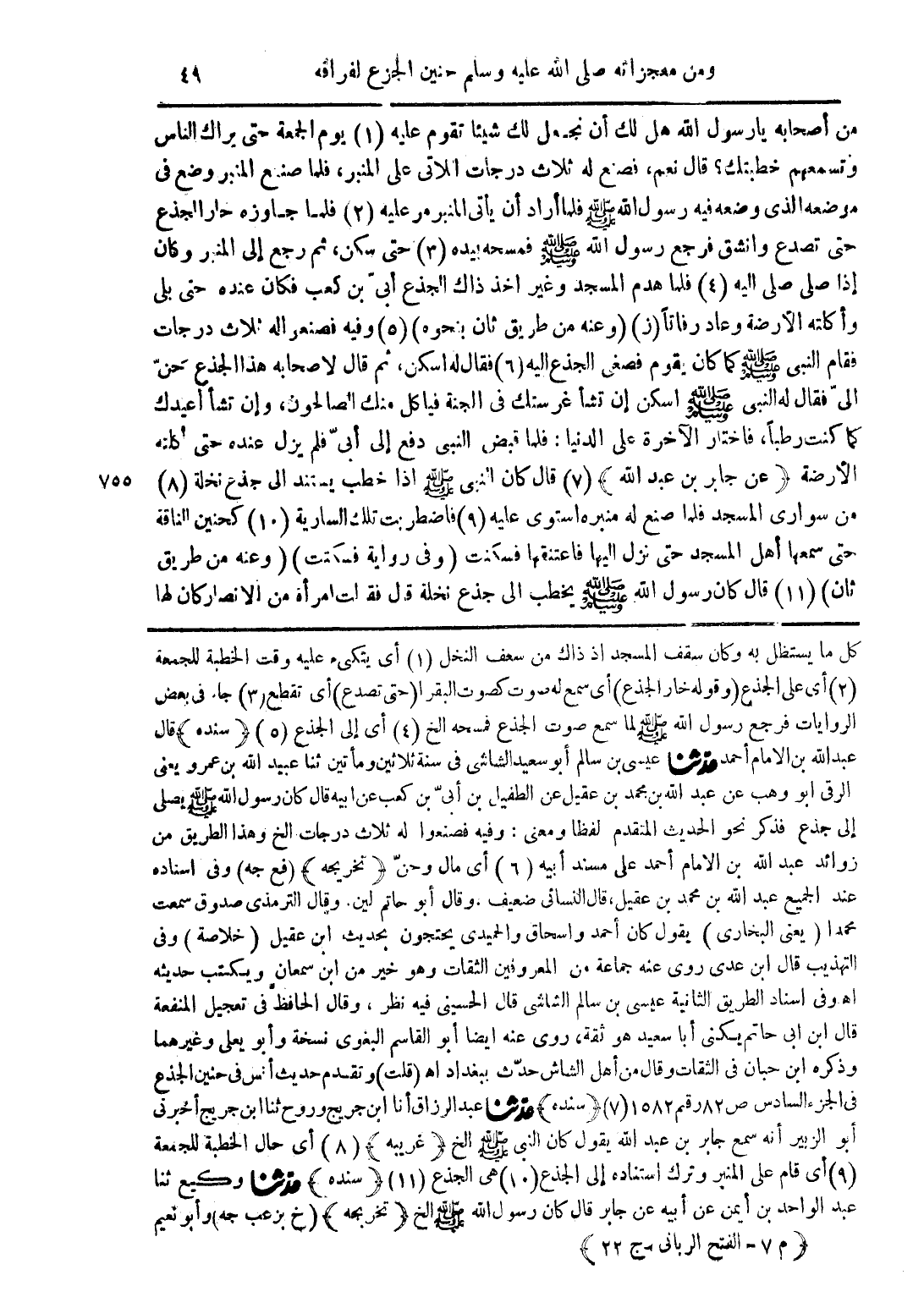 من أصحابه يا رسول الله هل لك أن نجعل لك شيئا تقوم عليه يوم الجمعة حتى يراك الناس وتسمعهم خطبتك؟ قال نعم، نصنع له ثلاث درجات للاتي على المنبر، فلما صنع المنبر وضع في موضعه الذي وضعه فيه رسول الله صلى الله عليه وسلم فلما أراد أن يأتي المنبر مر عليه فلما جاوزه حار الجذع حتى تصدع وانضق فرجع رسول الله صلى الله عليه وسلم فمسحه بيده حتى سكن، ثم رجع إلى المنبر وكان إذا صلى صلى إليه فلما هدم المسجد وغير أخذ ذاك الجذع أبىّ بن كعب فكان عنده حتى بلى وأكلته الأرضة وعاد رفاتًا (ز) (وعنه من طريق ثان بنحوه) وفيه فصنعوا له ثلاث درجات فقام النبي صلى الله عليه وسلم كما كان يقوم فصغى الجذع إليه فقال له اسكن، ثم قال لا صحابه هذا الجذع حنّ إلىّ فقال له النبي صلى الله عليه وسلم اسكن إن تشأ غرستك في الجنة فياكل منك الصالحون، وإن تشأ أعيدك كما كنت رطبًا، فاختار الآخرة على الدنيا: فلما قبض النبي دفع إلى أبىّ فلم يزل عنده حتى كلته الأرضة (عن جابر بن عبد الله) قال كان النبي صلى الله عليه وسلم إذا خطب يستند إلى جذع نخلة من سوارى المسجد فلما صنع له منبره استوى عليه فاضطرب تلك السارية كحنين الناقة حتى سمعها أهل المسجد حتى نزل إليها فاعتنقها فسكت (وفي رواية فسكت) (وعنه من طريق ثان) قال كان رسول الله صلى الله عليه وسلم يخطب إلى جذع نخلة قال فقلت امرأة من الأنصار كان لها