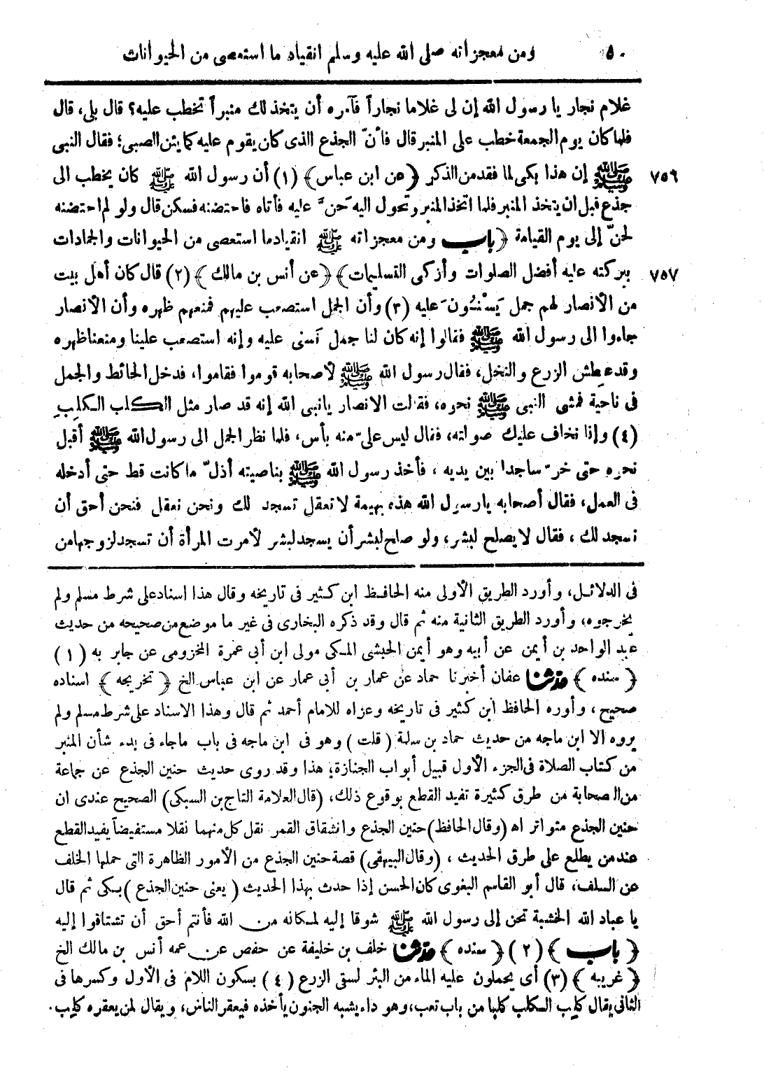 غلام نجار يا رسول الله إن لي غلاما نجارًا فآمره أن يتخذ لك منبرًا تخطب عليه؟ قال بلى، قال فلما كان يوم الجمعة خطب على المنبر قال فإنّ الجذع الذي كان يقوم عليه كما يئن الصبي؛ فقال النبي صلى الله عليه وسلم إن هذا بكى لما فقد من الذكر (عن ابن عباس) أن رسول الله صلى الله عليه وسلم كان يخطب إلى جذع قبل إن يتخذ المنبر فلما اتخذ المنبر وتحول إليه حنَّ عليه فأتاه فاحتصنه فسكن قال ولو م احتضنه لحنّ يوم القيامة (باب ومن معجزاته صلى الله عليه وسلم انقياد ما استعصى من الحيوانات والجمادات ببركته عليه أفضل الصلوات وأزكى التسليمات) (عن أنس بن مالك) قال كان أهل بيت من الأنصار لهم جمل يسنسون عليه وأن الجمل اسستصعب عليهم فمنعهم ظهره وأن الأنصار جاءوا إلى رسول الله صلى الله عليه وسلم فقالوا إنه كان لنا جمل نسنى عليه وإنه استصعب علينا ومنعنا ظهره وقد عطش الزرع والنخل، فقال رسول الله صلى الله عليه وسلم لأصحابه قوموا فقاموا، فدخل الحائط والحمل في ناحية فمشى النبي صلى الله عليه وسلم نحوه، فقلت الأنصار يا نبي الله إنه قد صار مثل الكلب الكلب وإذا نخاف عليك صولته، فقال ليس علىّ منه بأس، فلما نظر الجمل إلى رسول الله صلى الله عليه وسلم أقبل نحوه حتى حرّ ساجدا بين يديه، فأخذ رسول الله صلى الله عليه وسلم بناصيته أذلّ ما كانت قط حتى أدخله في العمل، فقال أصحابه يا رسول الله هذه بهيمة لا تعقل تسجد لك ونحن نعقل فنحن أحق أن نسجد لك، فقال لا يصلح لبشر، ولو صلح لبشر أن يسجد لبشر لأمرت المرأة أن تسجد لزوجها من