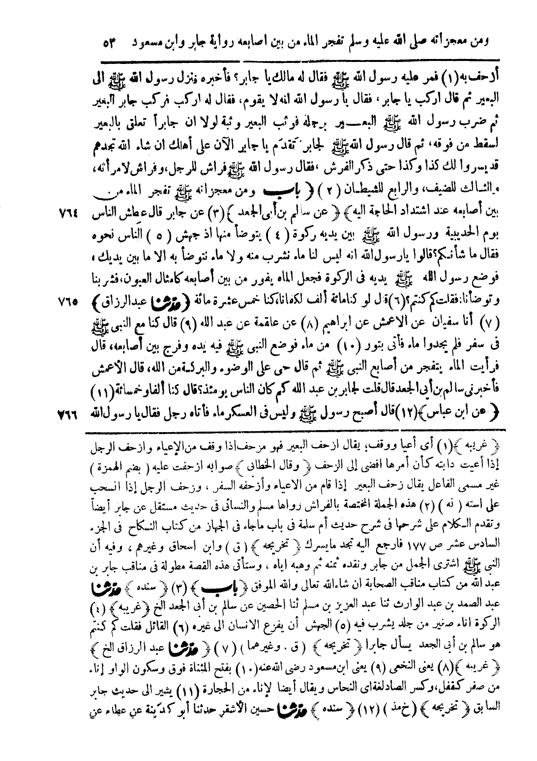 (غريبه) (1) أي أعيا ووقف؛ يقال ازحف البعير فهو مزحف إذا وقف من الإعياء وازحف الرجل إذا أعيت دابته كأن أمرها افضى إلى الزحف (وقال الخطابي) صوابه ازحفت عليه (بضم الهمزة) غير مسمى الفاعل يقال زحف البعير إذا قام من الاعياء وأزحفه السفر، وزحف الرجل إذا انسحب على استه (نه) (2) هذه الجملة المختصة بالفراش رواها مسلم والنسائي في حديث مستقل عن جابر أيضًا وتقدم الكلام على شرحها في شرح حديث أم سلمة في باب ما جاء في الجهاز من كتاب النكاح في الجزء السادس عشر ص 177 فارجع إليه تجد ما يسرك (تخريجه) (ق) وابن إسحاق وغيرهم، وفيه أن النبي صلى الله عليه وسلم اشترى الجمل من جابر ونقده ثمنه ثم وهبه إياه، وستأتي هذه القصة مطولة في مناقب جابر بن عبد الله من كتاب مناقب الصحابة إن شاء الله تعالى والله الموفق (باب) (3) (سنده) حدثنا عبد الصمد بن عبد الوارث ثنا عبد العزيز بن مسلم ثنا الحصين عن سالم بن أبي الجعد الخ (غريبه) (4) الركوة إناء صغير من جلد يشرب فيه (5) الجهش أن يفزع الإنسان إلى غيره (6) القائل فقلت كم كنت هو سالم بن أبي الجعد يسأل جابرا (تخريجه) (ق. وغيرهما) (7) (حدثنا عبد الرزاق الخ) (غريبه) (8) يعني النخعي (9) يعني ابن مسعود رضي الله عنه (10) بفتح المثناة فوق وسكون الواو إناء من صفر كقفل، وكسر الصاد لغة أي التحاس ويقال أيضا لإناء من الحجارة (11) يشير إلى حديث جابر السابق (تخريجه) (خ مذ) (12) (سنده) حدثنا حسين الأشقر حدثنا أبو كدبنة عن عطاء عن