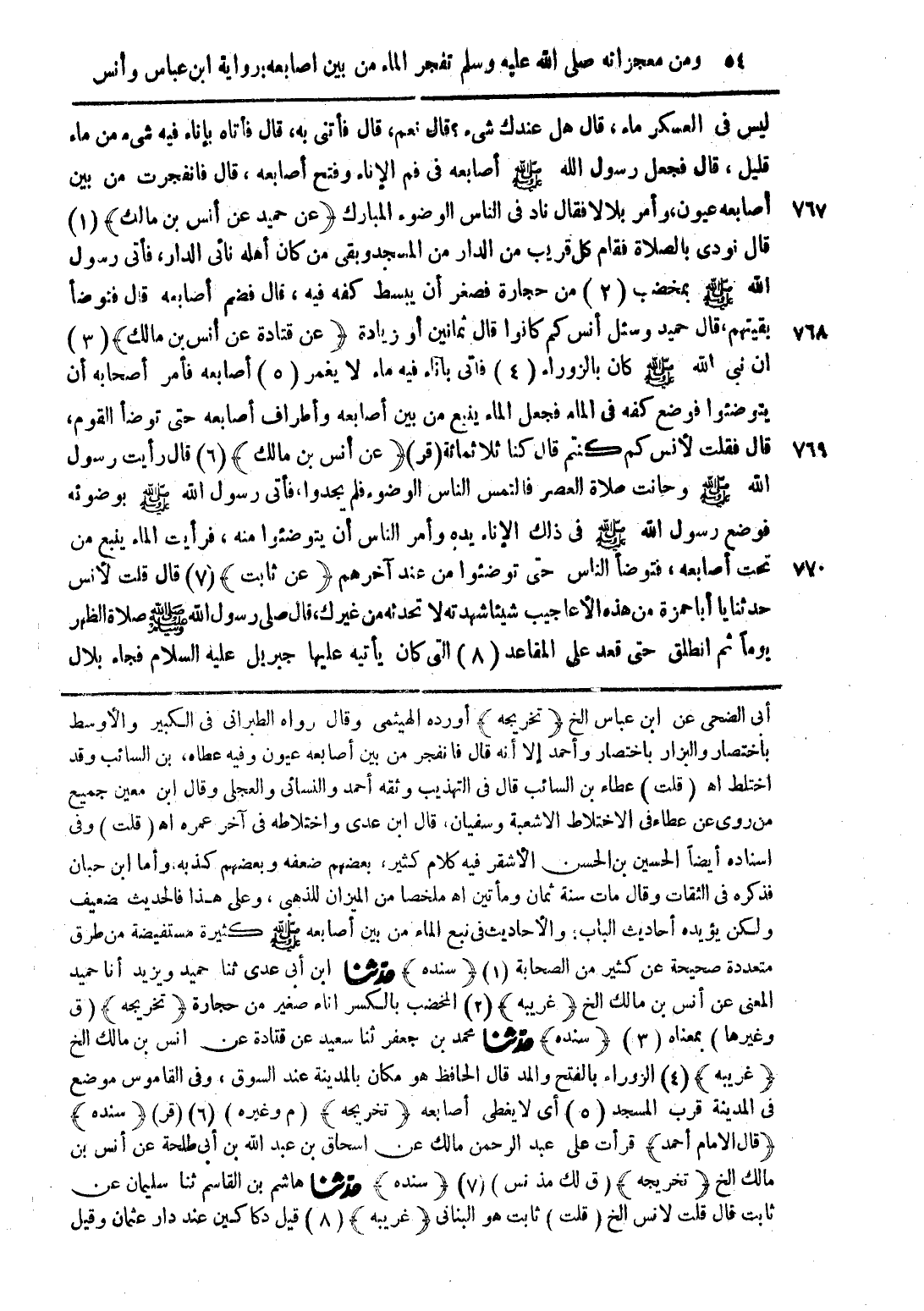 أبي الضحى عن ابن عباس الخ (تخريجه) أورده الهيثمي وقال رواه الطبراني في الكبير والأوسط بأختصار والبزار باختصار وأحمد إلا أنه قال فانفجر من بين أصابعه عيون وفيه عطاه، بن السائب وقد اختلط اهـ (قلت) عطاء بن السائب قال في التهذيب وثقه أحمد والنسائي والعجلي وقال ابن معين جميع من روى عن عطاء في الاختلاط الاشعبة وسفيان، قال ابن عدى واختلاطه في آخر عمره اهـ (قلت) وفي إسناده أيضًا الحسين بن الحسن الأشقر فيه كلام كثير، بعضهم ضعفه وبعضهم كذبه وأما ابن حبان فذكره في الثقات وقال مات سنة ثمان ومأتين اهـ ملخصا من الميزان للذهبي، وعلى هذا فالحديث ضعيف ولكن يؤيده أحاديث الباب، والأحاديث في نبع الماء من بين أصابعه صلى الله عليه وسلم كثيرة مستفيضه من طرق متعددة صحيحة عن كثير من الصحابة (1) (سنده) حدثنا ابن أبي عدى ثنا حميد ويزيد أنا حميد المعنى عن أنس بن مالك الخ (غريبه) (2) المخضب بالكسر إناء صغير من حجارة (تخريجه) (ق. وغيرهما) بمعناه (3) (سنده) حدثنا محمد بن جعفر ثنا سعيد عن قتادة عن أنس بن مالك الخ (غريبه) (4) الزوراء بالفتح والمد قال الحافظ هو مكان بالمدينة عند السوق، وفي القاموس موضع في المدينة قرب المسجد (5) أي لا يغطى أصابعه (تخريجه) (م وغيره) (6) (قر) (سنده) (قال الإمام أحمد) قرأت على عبد الرحمن مالك عن إسحاق بن عبد الله بن أبي طلحة عن أنس بن مالك الخ (تخريجه) (ق لك مذ نس) (7) (سنده) حدثنا هاشم بن القاسم ثنا سليمان عن ثابت قال قلت لاسن الخ (قلت) ثابت هو البناني (غريبه) (8) قيل دكاكين عند دار عثمان وقيل