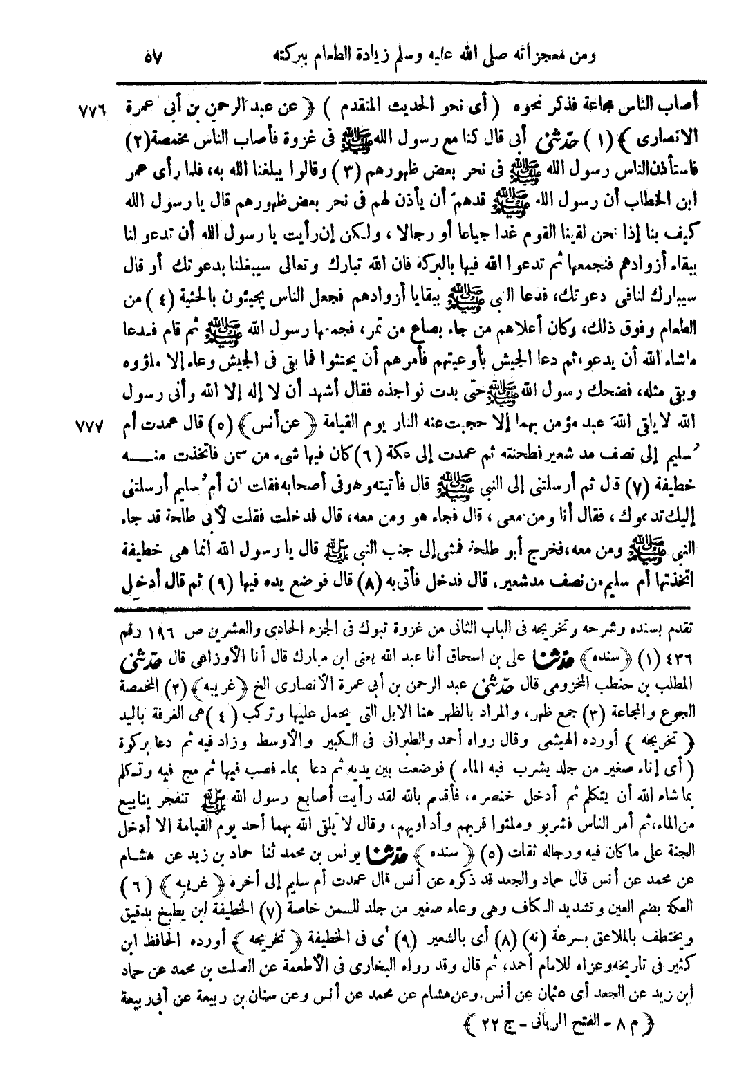 تقدم بسنده وشرحه وتخريجه في الباب الثاني من غزوة تبوك في الجزء الحادي والعشرين ص 1996 رقم 436 (1) (سنده) حدثنا على بن إسحاق أنا عبد الله يعني ابن مبارك قال أنا الأوزاعي قال حدثني المطلب بن حنطب المخزومي قال حدثني عبد الرحمن بن أبي عمرة الأنصاري الخ (غريبه) (2) المخصة الجوع والمجاعة (3) جمع ظهر، والمراد بالظهر هنا الإبل التي يحمل عليها وتركب (4) هي الغرفة باليد (تخريجه) أورده الهيثمي وقال رواه أحمد والطبراني في الكبير والأوسط وزاد فيه ثم دعا بركوة (أي إناء صغير من جلد يشرب فيه الماء) فوضعت بين يديه ثم دعا بماء فصب فيها ثم مج فيه وتكلم بما شاء الله أن يتكلم ثم أدخل خنصره، فأقسم بالله لقد رأيت أصابع رسول الله صلى الله عليه وسلم تنفجر ينابيع من الماء، ثم أمر الناس فشربو وملئوا قربهم وأداويهم، وقال لا يلقى الله بهما أحد يوم القيامة إلا أدهل الجنة على ما كان فيه ورجاله ثقلت (5) (نده) حدثنا يونس بن محمد ثنا حماد ين زيد عن هشام عن محمد عن أنس قال حماد والجعد قد ذكره عن أنس قال عمدت أم سليم إلى أخره (غريبه) (6) العكة بضم العين وتشديد الكاف وهي وعاء صغير من جلد للسمن خاصة (7) الخطيفة لبن يطبخ بدقيق ويختطف بالملاعق بسرعة (نه) (8) أي بالشعير (9) أي في الخطيفة (تخريجه) أورده الحافظ ابن كثير في تاريخه وعزاه للإمام أحمد، ثم قال وقد رواه البخاري في الأطعمة عن الصلت بن محمد عن حماد ابن زيد عن الجعد أي عثمان عن أنس وعن هشام عن محمد عن أنس وعن سنان بن ربيعة عن أبي ربيعة