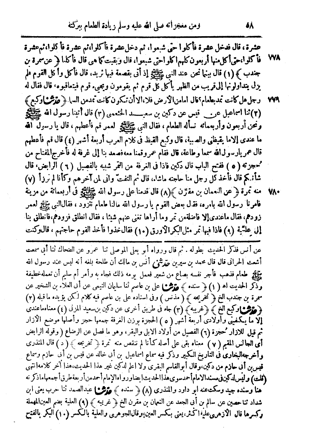 عشرة، قال فدخل عشرة فأكلوا حتى شبعوا، ثم دخل عشرة فأكلوا، ثم عشرة فأكلوا، ثم عشرة فأكلوا، حتى أكل منها أربعون كلهم أكلوا حتى شبعوا، قال وبقيت كما هي فأكلنا (عن سمرة بن جندب) قال بينما نحن عند النبي صلى الله عليه وسلم إذ أتى بقصعة فيها ثريد، قال فأكل وأكل القوم فلم يزل يتداولونها إلى قريب من الزهر يأكل كل قوم ثم يقومون ويجيء قوم فيتعاقبوه، قال فقال له رجل هل كانت تمد بطعام؟ قال أما من الأرض فلا، إلا أن تكون كانت تمد من السما. (حدثنا وكيع) ثنا إسماعيل عن قيس عن دكين بن سعيد الخثعمي قال أتينا رسول الله صلى الله عليه وسلم ونحن أربعون وأربعمائة نسأله الطعام، فقال النبي صلى الله عليه وسلم لعمر قم فأعطهم، قال يا رسول الله ما عندي إلا ما يقيظني والصبية، قال وكيع القيظ في كلام العرب أربعة أشهر قال قم فأعطهم قال عمر يا رسول الله سمعا وطاعة، قال فقام عمرو قمنا معه فصعد بنا إلى غرفة له فأخرج المفتاح من حجزته ففتح الباب قال دكين فإذا في الغرفة من التمر شبيه بالفصيل الرابض، قال شأنكم قال فأخذ كل رجل منا حاجته ما شاء، قال ثم التفتّ وإني لمن آخرهم وكأنا لم ترزأ منه تمرة (عن النعمان بن مقرِّن) قال قدمنا على رسول الله صلى الله عليه وسلم في أربعمائة من مزينة فامرنا رسول الله بامره، فقال بعض القوم يا رسول الله ما لنا طعام نتزود، فقال النبي صلى الله عليه وسلم لعمر زودهم، فقال ما عندي إلا فاضلة من تمر وما أراها تغني عنهم شيئا، فقال انطلق فزودهم، فانطلق بنا إلى عليه فإذا فيها تمر مثل البكر الأورق فقال خذوا فأخذ القوم حاجتهم، قال وكنت