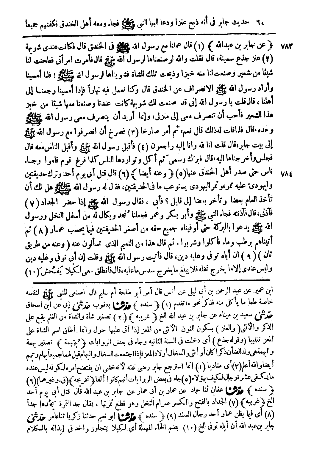 (عن جابر بن عبد الله) قال عملنا مع رسول الله صلى الله عليه وسلم في الخندق قال فكانت عندي شويهة عنز جذع سمينة، قال فقلت والله لو صنعناها لرسول الله صلى الله عليه وسلم قال فأمرت امرأتي فطحنت لنا شيئا من شعير وصنعت لنا منه خبزا وذبحت تلك الشاة فشويناها لرسول الله صلى الله عليه وسلم؛ فلما أمسينا وأراد رسول الله صلى الله عليه وسلم الانصراف عن الخندق قال وكنا نعمل فيه نهارًا فإذا أمسينا رجعنا إلى أهلنا، قال قلت يا رسول الله إني قد صنعت لك شويهة كانت عندنا وصنعنا معها شيئا من خبز هذا الشعير فأحب أن تنصرف معي إلى منزلي، وإنما أريد أن ينصرف معي رسول الله صلى الله عليه وسلم وحده، قال فلما قلت له ذاك قال نعم، ثم أمر صارخا فصرخ أن انصرفوا مع رسول الله صلى الله عليه وسلم إلى بيت جابر، قال قلت أنا الله وأنا إليه راجعون فأقبل رسول الله صلى الله عليه وسلم وأقبل الناس معه قال فجلس وأخرجناها إليه، قال فبرّك وسمىّ ثم أكل وتواردها الناس كلما فرغ قوم قاموا وجاء ناس حتى صدر أهل الخندق عنها (وعنه أيضا) قال قتل أبي يوم أحد وترك حديقتين وليهودىّ عليه تمر، وتمر اليودى يستوعب ما في الحديقتين، فقال له رسول الله صلى الله عليه وسلم هل لك أن تأخذ العام بعضا وتأخر بعضا إلى قايل؟ قأبى، فقال رسول الله صلى الله عليه وسلم إذا حضر الجداد فآذنى، قال فآذنته فجاء النبي صلى الله عليه وسلم وأبو بكر وعمر فجعلنا نجد ويكال له من أسفل النخل ورسول الله صلى الله عليه وسلم يدعوا بالبركة حتى أوفيناه جميع حقه من أصغر الحديقتين فيما يحسب عمار ثم أتيناهم برطب وماء فأكلوا وشربوا. ثم قال هذا من النعيم الذي تسألون عنه (وعنه من طريق ثان) أن أباه توفى وعليه دين، قال فأتيت رسول الله صلى الله عليه وسلم وقلت إن أبي توفى وعليه دين وليس عندي إلا ما يخرج نخله فلا يبلغ ما يخرج سدس ما عليه، قال فانطلق معي لكيلا يفحش