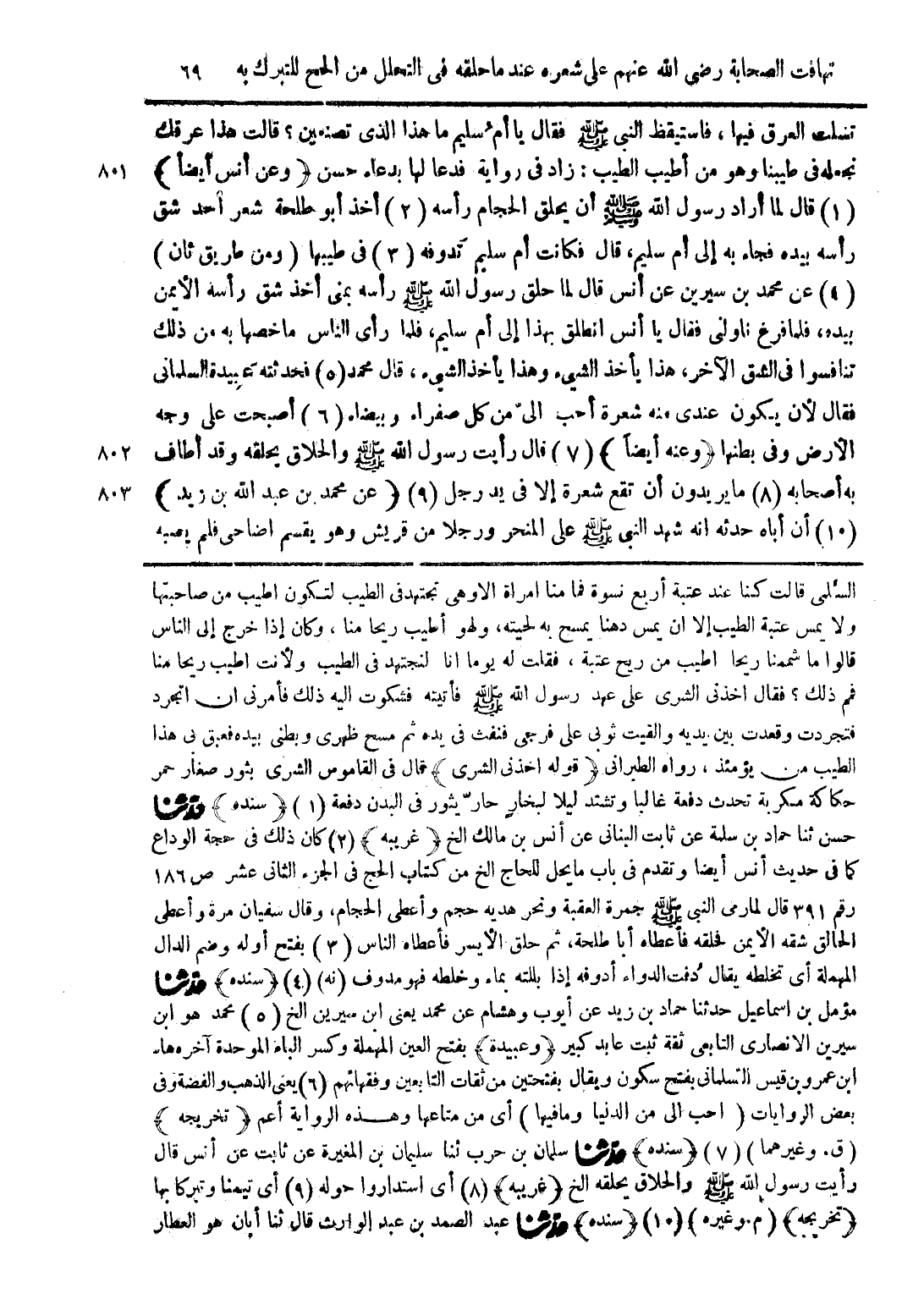 تسلت العرق فيها، فاستيقظ النبى صلى الله عليه وسلم فقال يا أم سليم ما هذا الذى تصنعين؟ قالت هذا عرقك نجعله فى طيبنا وهو من أطيب الطيب: زاد فى رواية فدعا لها بدعاء حسن (وعن أنس أيضا) قال لما أراد رسول الله صلى الله عليه أن يحلق الحجام رأسه أخذ أبو طلحة شعر احد شق رأسه بيده فجاء به إلى أم سليم، قال فكانت أم سليم تدوفه فى طيبها (ومن طريق ثان) عن محمد بن سيرين عن أنس قال لما حلق رسول الله صلى الله عليه وسلم رأسه بمنى أخذ شق رأسه الأيمن بيده، فلما فرغ ناولنى فقال يا أنس انطلق بهذا إلى أم سليم، فلما رأى الناس ما خصها به من ذلك تنافسوا فى الشق الآخر، هذا يأخذ الشيء وهذا يأخذ الشيء، قال محمد فحدثته عبيدة السلمانى فقال لأن يكون عندى منه شعرة أحب الىّ من كل صفراء وبيضاء أصبحت على وجه الأرض وفى بطنها (وعنه أيضًا) قال رأيت رسول الله صلى الله عليه وسلم والحلاق يحلقه وقد أطاف به أصحابه ما يريدون أن تقع شعرة إلا فى يد رجل (عن محمد بن عبد الله بن زيد) أن أباه حدثه انه شهد النبى صلى الله عليه وسلم على المنحر ورجلا من قريش وهو يقسم اضاحى فلم يصبه