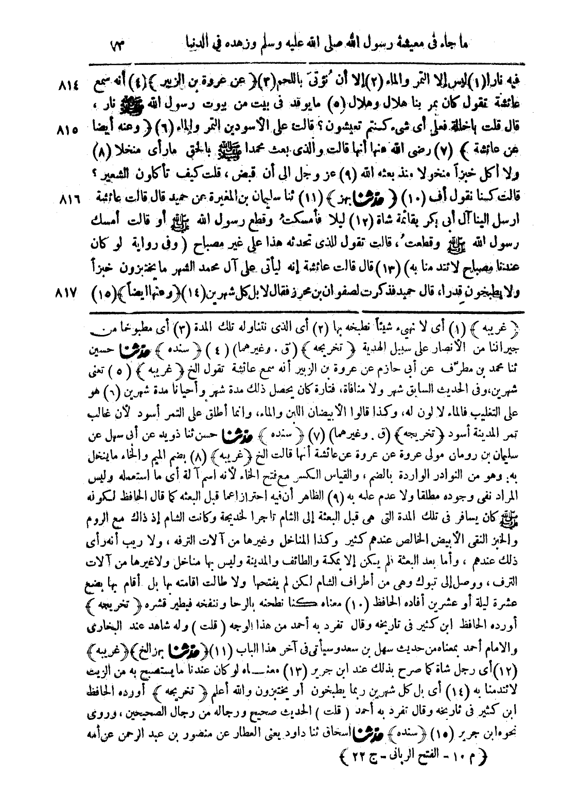 (غريبه) (1) أى لا نهيئ شيئاً نطبخه بها (2) أى الذى نتناوله تلك المدة (3) أى مطبوخا من جيراننا من الأنصار على سبيل الهدية (تخريجه) (ق. وغيرهما) (4) (سنده) حدّثنا حسين ثنا محمد بن مطرّف عن أبى حازم عن عروة بن الزبير أنه سمع عائشة تقول الخ (غريبه) (5) تعنى شهرين، وفى الحديث السابق شهر ولا منافاة، فتارة كان يحصل ذلك مدة شهر وأحيانا مدة شهرين (6) هو على التغليب فالماء لا لون له، وكذا قالوا الأبيضان اللبن والماء، وانما أطلق على التمر أسود لأن غالب تمر المدينة أسود (تخريجه) (ق. وغيرهما) (7) (سنده) حدّثنا حسن ثنا ذويد عن أبى سهل عن سليمان بن رومان مولى عروة عن عروة عن عائشة أنها قالت الخ (غريبه) (8) بضم الميم والخاء ما ينخل به: وهو من النوادر الواردة بالضم، والقياس الكسر مع فتح الخاء لأنه اسم آلة أى ما استعمله وليس المراد نفى وجوده مطلقا ولا عدم علمه به (9) الظاهر أن فيه احترازا عما قبل البعثة كما قال الحافظ لكونه صلى الله عليه وسلم كان يسافر فى تلك المدة التى هى قبل البعثة إلى الشام تاجرا لخديجة وكانت الشام إذ ذاك مع الروم والخبز النقى الأبيض الخالص عندهم كثير وكذا المناخل وغيرها من آلات الترفه، ولا ريب أنه رأى ذلك عندهم، وأما بعد البعثة فلم يكن إلا بمكة والطائف والمدينة وليس بها مناخيل ولا غيرها من آلات الترف، ووصل إلى تبوك وهى من أطراف الشام لكن لم يفتحها ولا طالت اقامته بها بل أقام بها بضع عشرة ليلة أو عشرين أفاده الحافظ (10) معناه كنا نطحنه بالرحا وننفخه فيطير قشره (تخريجه) أورده الحافظ ابن كثير فى تاريخه وقال تفرد به أحمد من هذا الوجه (قلت) وله شاهد عند البخارى والإمام أحمد بمعناه من حديث بن سعد وسيأتى فى آخر هذا الباب (11) (حدّثنا بهز الخ) (غريبه) (12) أى رجل شاة كما صرح بذلك عند ابن جرير (13) معناه لو كان عندنا ما يستصبح به من الزيت لائتدمنا به (14) أى بل كل شهرين ربما يطبخون أو يختبزون والله أعلم (تخريجه) أورده الحافظ ابن كثير فى تاريخه وقال تفرد به أحمد (قلت) الحديث صحيح ورجاله من رجال الصحيحين، وروى نحوه ابن جرير (15) (سنده) حدّثنا اسحاق ثنا داود يعنى العطار عن منصور بن عبد الرحمن عن أمه