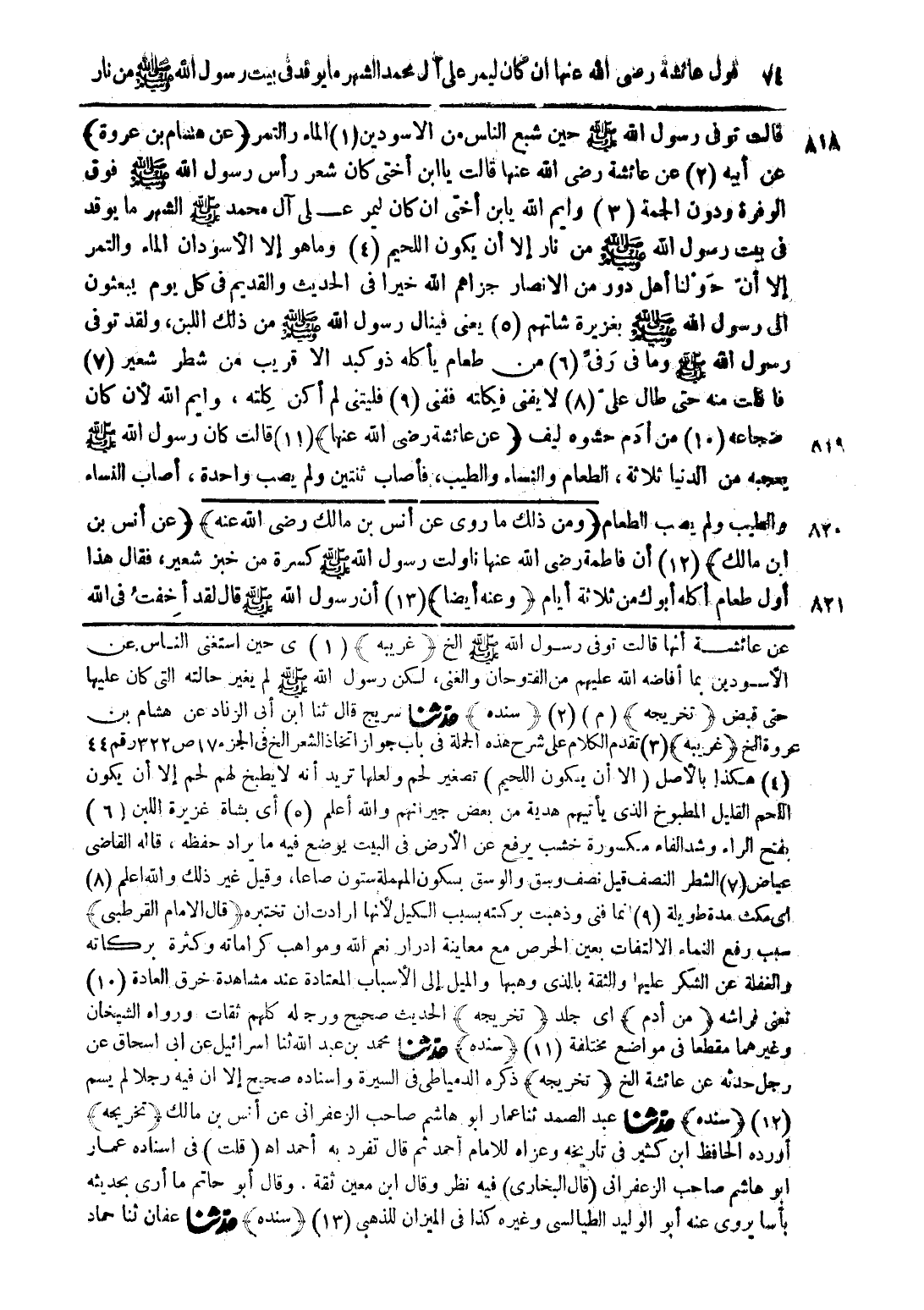 عن عائشة أنها قالت توفى رسول الله صلى الله عليه وسلم الخ (غريبه) (1) ى حين استغنى الناس عن الأسودين بما أفاضه الله عليهم من الفتوحان والغنى، لكن رسول الله صلى الله عليه وسلم لم يغير حالته التى كان عليها حتى قبض (تخريجه) (م) (2) (سنده) حدّثنا سريج قال ثنا ابن أبى الزناد عن هشام بن عروة الخ (غريبه) (3) تقدم الكلام على شرح هذه الجملة فى باب جواز اتخاذ الشعر الخ فى الجزء 17 ص 322 رقم 44 (4) هكذا بالأصل (الا أن يكون اللحيم) تصغير لحم ولعلها تريد أنه لا يطبخ لهم لحم إلا أن يكون اللحم القليل المطبوخ الذى يأتيهم هدية من بعض جيرانهم والله أعلم (5) أى بشاة غزيرة اللبن (6) بفتح الراء وشد الفاء مكسورة خشب يرفع عن الأرض فى البيت يوضع فيه ما يراد حفظه، قاله القاضى عياض (7) الشطر النصف قيل نصف وسق والوسق بسكون المهملة ستون صاعاً، وقيل غير ذلك والله أعلم (8) أى مكث مدة طويلة (9) انما فنى وذهبت بركته بسبب الكيل لأنها ارادت ان تختبره (قال الامام القرطبي) سبب رفع النماء الالتفات بعين الحرص مع معاينة ادرار نعم الله ومواهب كراماته وكثرة بركاته والغفلة عن الشكر عليها والثقة بالذى وهبها والميل إلى الأسباب المعتادة عند مشاهدة خرق العادة (10) تعنى فراشه (من أدم) اى جلد (تخريجه) الحديث صحيح ورجاله كلهم ثقات ورواه الشيخان وغيرهما مقطعا فى مواضع مختلفة (11) (سنده) حدّثنا محمد بن عبد الله ثنا اسرائيل عن ابى اسحاق عن رجل حدثه عن عائشة الخ (تخريجه) ذكره الدمياطى فى السيرة واسناده صحيح إلا ان فيه رجلا لم يسم (12) (سنده) حدّثنا عبد الصمد ثنا عمار ابو هاشم صاحب الزعفرانى عن أنس بن مالك (تخريجه) أورده الحافظ ابن كثير فى تاريخه وعزاه للامام أحمد ثم قال تفرد به أحمد اه (قلت) فى اسناده عمار ابو هاشم صاحب الزعفرانى (قال البخاري) فيه نظر وقال ابن معين ثقة. وقال أبو حاتم ما أرى بحديثه باسا يروى عنه أبو الوليد الطيالسى وغيره كذا فى الميزان للذهبى (13) (سنده) حدّثنا عفان ثنا حماد
