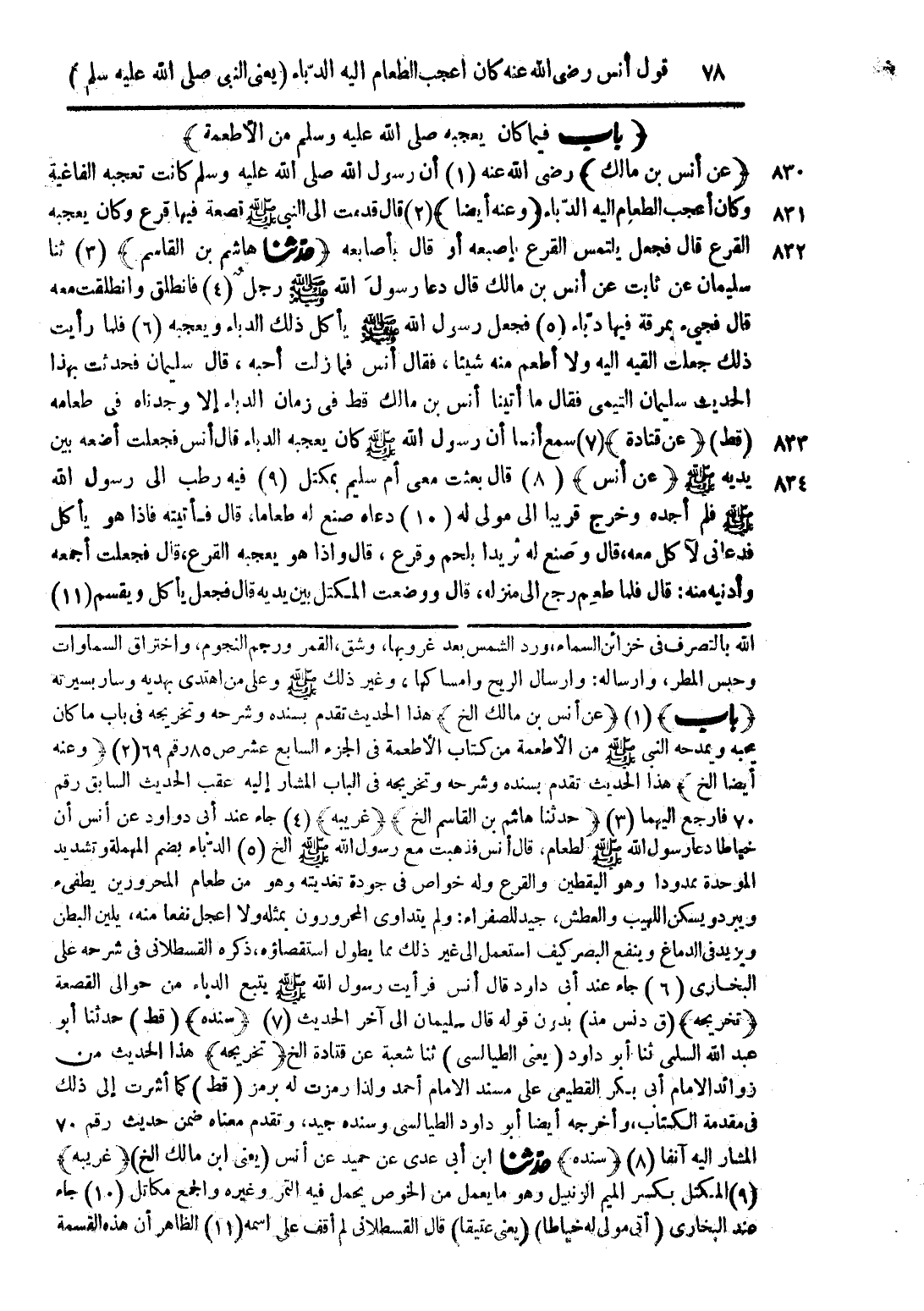 (عن أنس بن مالك) رضى الله عنه أن رسول الله صلى الله عليه وسلم كانت تعجبه الفاغية وكان أعجب الطعام اليه الدبّاء (وعنه أيضا) قال قدمت إلى النبى صلى الله عليه وسلم قصعة فيها قرع وكان يعجبه القرع قال فجعل يلتمس القرع بإصبعه أو قال بأصابعه (حدثنا هشام بن القاسم) ثنا سليمان عن ثابت عن أنس بن مالك قال دعا رسول الله صلى الله عليه وسلم رجل فانطلق وانطلقت معه قال فجيء بمرقة فيها دبّاء فجعل رسول الله صلى الله عليه وسلم يأكل ذلك الدباء ويعجبه فلما رأيت ذلك جعلت القيه اليه ولا أطعم منه شيئا، فقال أنس فما زلت أحبه، قال سليمان فحدثت بهذا الحديث سليمان التيمى فقال ما أتينا أنس بن مالك قط فى زمان الدباء إلا وجدناه فى طعامه (قط) (عن قتادة) سمع أنسا أن رسول الله صلى الله عليه وسلم كان يعجبه الدباء قال أنس فجعلت أضعه بين يديه صلى الله عليه وسلم (عن أنس) قال بعثت معى أم سليم بمكتل فيه رطب إلى رسول الله صلى الله عليه وسلم فلم أجده وخرج قريبا إلى مولى له دعاه صنع له طعاما، قال فأتيته فاذا هو يأكل فدعانى لآكل معه، قال وصنع له ثريدا بلحم قرع، قال واذا ما يعجبه القرع، قال فجعلت أجمعه وأدنيه منه: قال فلما طعم رجع إلى منزله، قال ووضعت المكتل بين يديه قال فجعل يأكل ويقسم