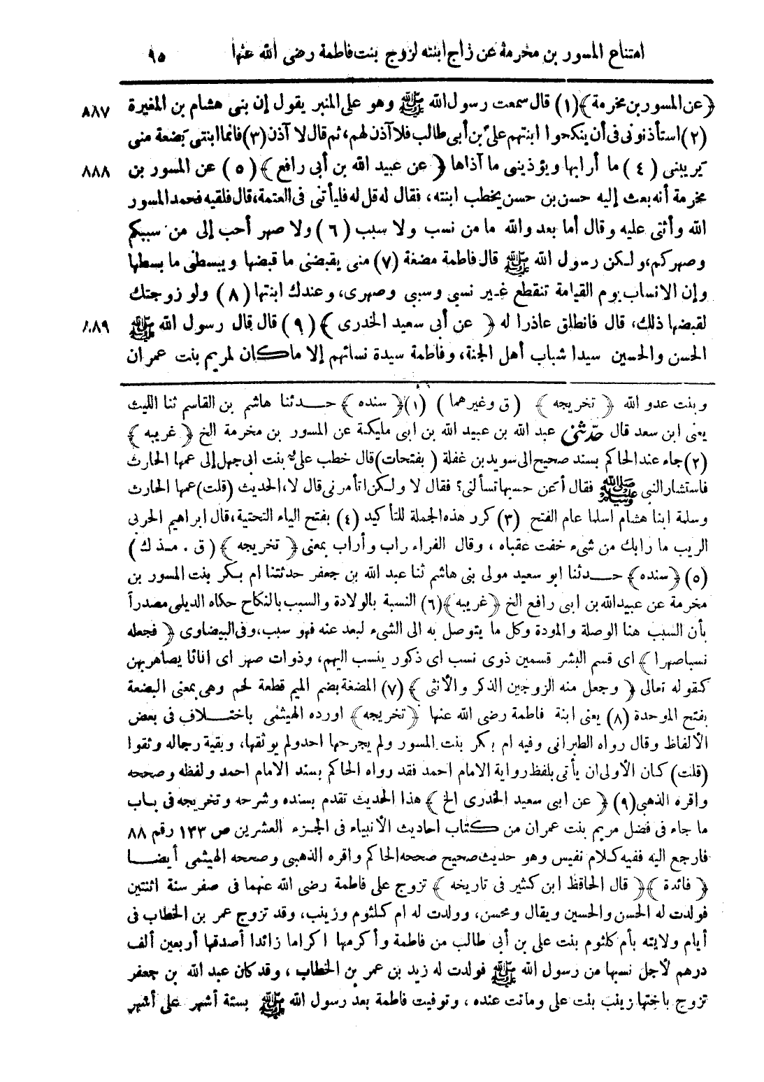 (عن المسور بن مخرمة) قال سمعت رسول الله صلى الله عليه وسلم وهو على المنبر يقول إن بنى هشام بن المغيرة استأذنونى فى أن ينكحوا ابنتهم على بن أبى طالب فلا آذن لهم، ثم قال لا آذن فانما ابنتى بضعة منى يريبنى ما أرابها ويؤذينى ما آذاها (عن عبيد الله بن أبى رافع) عن المسور بن مخرمة أنه بعث إليه حسن بن حسن يخطب ابنته، فقال له قل له فليأتنى فى العتمة، قال فلقيه فحمد المسور الله وأثنى عليه وقال أما بعد والله ما من نسب ولا سبب ولا صهر أحب إلى من سببكم وصهركم، ولكن رسول الله صلى الله عليه وسلم قال فاطمة مضغة منى يقبضنى ما قبضها ويبسطنى ما بسطها وإن الانساب يوم القيامة تنقطع غير نسبى وسببى وصهري، وعندك ابنتها ولو زوجتك لقبضها ذلك، قال فانطلق عاذرا له (عن أبى سعيد الخدري) قال قال رسول الله صلى الله عليه وسلم الحسن والحسين سيدا شباب أهل الجنة، وفاطمة سيدة نسائهم إلا ما كان لمريم بنت عمران