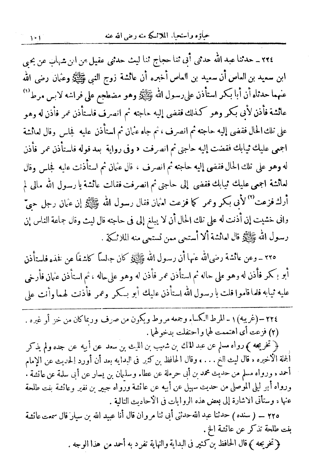 224 - حدثنا عبد الله حدثنى أبى ثنا حجاج ثنا ليث حدثنى عقيل عن ابن شهاب عن يحيى ابن سعيد بن العاص أن سعيد بن العاص أخبره أن عائشة زوج النبى صلى الله عليه وسلم وعثمان رضي الله عنهما حدثاه أن أبا بكر استأذن على رسول الله صلى الله عليه وسلم وهو مضطجع على فراشه لابس مرط (1) عائشة فأذن لأبى بكر وهو كذلك فقضى إليه حاجته ثم انصرف فاستأذن عمر فأذن له وهو على تلك الحال فقضى إليه حاجته ثم انصرف، ثم جاء عثمان ثم استأذن عليه فجلس وقال لعائشة اجمعى عليك ثيابك فقضت إليه حاجتى ثم انصرفت "وفى راية بعد قوله فاستأذن عمر فأذن له وهو على تلك الحال فقضى إليه حاجته ثم انصرف، قال عثمان ثم استأذنت عليه فجلس وقال لعائشة اجمعى عليك ثيابك فقضى إلى حاجتى ثم انصرفت فقالت عائشة يا رسول الله مالى لم أرك فزعت (2) لأبى بكر وعمر كما فزعت لعثمان فقال رسول الله صلى الله عليه وسلم إن عثمان رجل حيّى وانى خشيت إن أذنت له على تلك الحال أن لا يبلغ إلى فى حاجته قال ليث وقال جماعة الناس إن رسول الله صلى الله عليه وسلم قال لعائشة ألا أستحى ممن تستحى منه الملائكة.