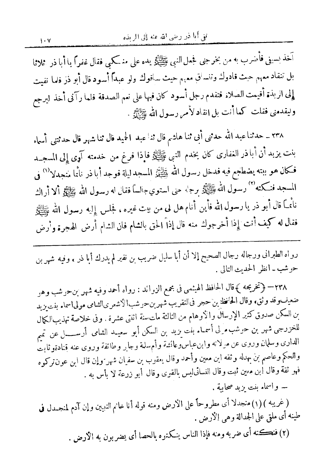 238 - حدثنا عبد الله حدثنى أبى ثنا هاشم قال ثنا عبد الحميد قال ثنا شهر قال حدثتنى أسماء بنت يزيد أن أبا ذر الغفارى كان يخدم النبى صلى الله عليه وسلم فإذا فرغ من خدمته آوى إلى المسجد فكان هو بيته يضطجع فيه فدخل رسول الله صلى الله عليه وسلم المسجد ليلة فوجد أبا ذر نائماً منجدلاً (1) فى المسجد فنكته (2) رسول الله صلى الله عليه وسلم برجله حتى استوي جالساً فقال له رسول الله صلى الله عليه وسلم ألا أراك نائماً قال أبو ذر يا رسول الله فأين أنام هل لى من بيت غيره، فجلس إليه رسول الله صلى الله عليه وسلم فقال له كيف أنت إذا أخرجوك منه قال إذا الحق بالشام فان الشام أرض الهجرة وأرض