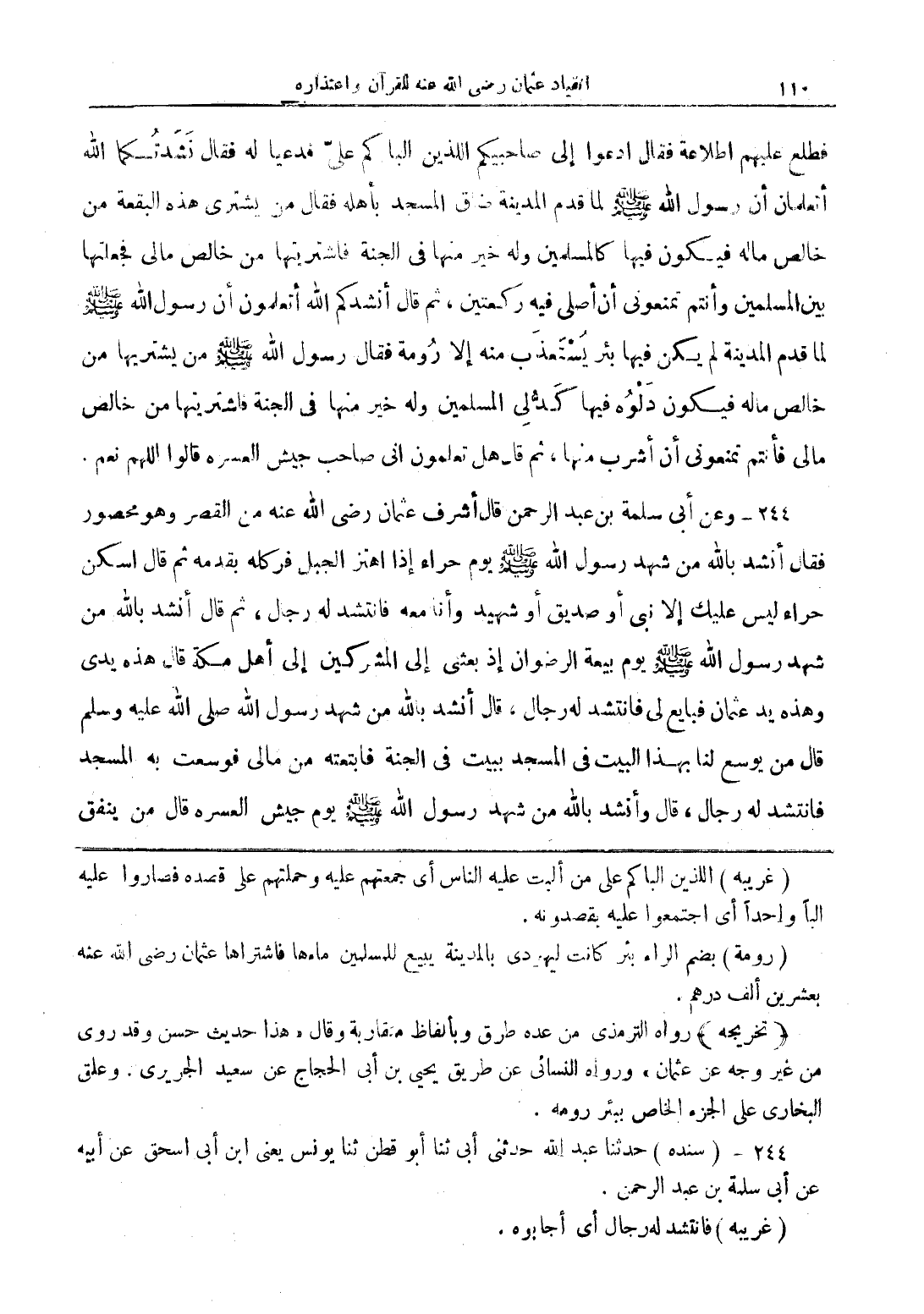 244 - وعن أبى سلمة بن عبد الرحمن قال أشرف عثمان رضي الله عنه من القصر وهو محصور فقال أنشد بالله من شهد رسول الله صلى الله عليه وسلم يوم حراء إذا اهتز الجبل فركله بقدمه ثم قال اسكن حراء ليس عليه إلا نبى أو صديق أو شهيد وأنا معه فانتشد له رجل، ثم قال أنشد بالله من شهد رسول الله صلى الله عليه وسلم يوم بيعة الرضوان إذ بعثنى إلى المشركين إلى أهل مكة قال هذه يدى وهذه يد عثمان فبايع لى فانتشد له رجال، قال أنشد بالله من شهد رسول الله صلى الله عليه وسلم قال من يوسع لنا بهذا البيت فى المسجد بيت فى الجنة فابتعته من مالى فوسعت به المسجد فانتشد له رجال، قال وأنشد بالله من شهد رسول الله صلى الله عليه وسلم يوم جيش العسره قال من ينفق