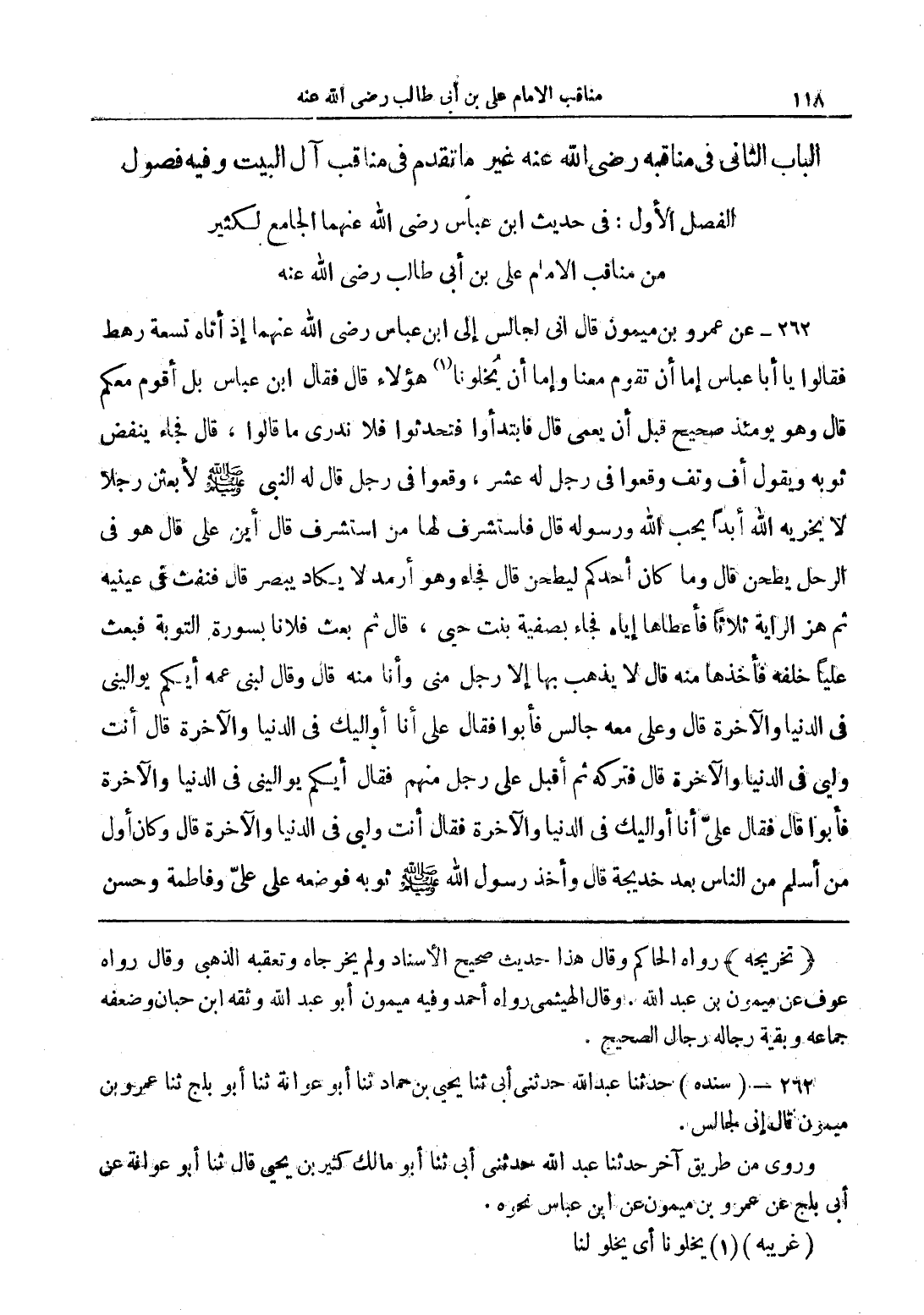 262 - عن عمرو بن ميمون قال انى لجالس إلى ابن عباس رضي الله عنهما إذا أتاه تسعة رهط فقالوا يا أبا عباس إما ان تقوم معنا وإما أن يٌخلونا (1) هؤلاء قال فقال ابن عباس بل أقوم معكم قال وهو يؤمئذ صحيح قبل أن يعمى قال فابتدأ فابتدأوا فتحدثوا فلا ندرى ما قالوا، قال فجاء ينفض ثوبه ويقول أف وتف وقعوا فى رجل له عشر، وقوعوا فى رجل قال له النبى صلى الله عليه وسلم لأبعثن رجلاً لا يخريه الله أبداً يحب الله ورسوله قال فاستشرف لها من استشرف قال أين على قال هو فى الرحل يطحن قال وما كان أحدكم ليطحن قال فجاء وهو أرمد لا يكاد يبصر قال فنفث فى عينيه ثم هز الراية ثلاثاً فأعطاها إياه فاء بصفته بنت حيى، قال ثم بعث فلانا بسورة التوبة فبعث علياً خلفه فأخذها منه قال لا يذهب بها إلا رجل منى وأنا منه قال وقال لبنى عمه أيكم يوالينى فى الدنيا والآخرة قال وعلى معه جالس فأبوا فقال على أنا أواليك فى الدنيا والآخرة قال أنت وليى فى الدنيا والآخرة قال فتركه ثم أقبل على رجل منهم فقال أيكم يوالينى فى الدنيا والآخرة فأبوا قال قال علىّ أنا أواليك فى الدنيا والآخرة فقال أنت وليى فى الدنيا والآخرة قال وكان أول من أسلم من الناس بعد خديجة قال وأخذ رسول الله صلى الله عليه وسلم ثوبه فوضعه على علىّ وفاطمة وحسن