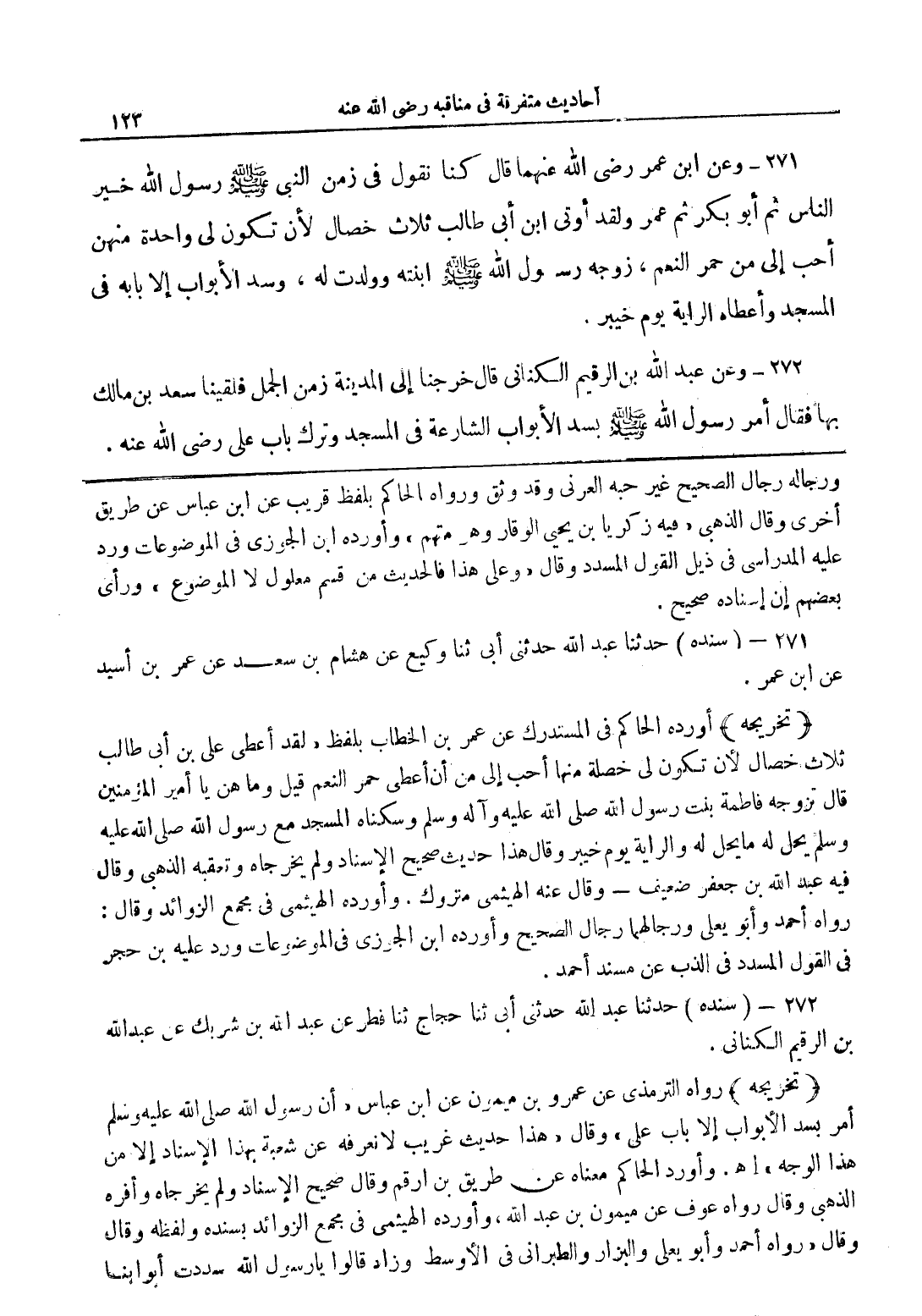 272 - وعن عبد الله بن الرقيم الكنانى قال خرجنا إلى المدينة زمن الجمل فلقينا سعد بن مالك بها فقال أمر رسول الله صلى الله عليه وسلم بسد الأبواب الشارعة فى المسجد وترك باب على رضي الله عنه.