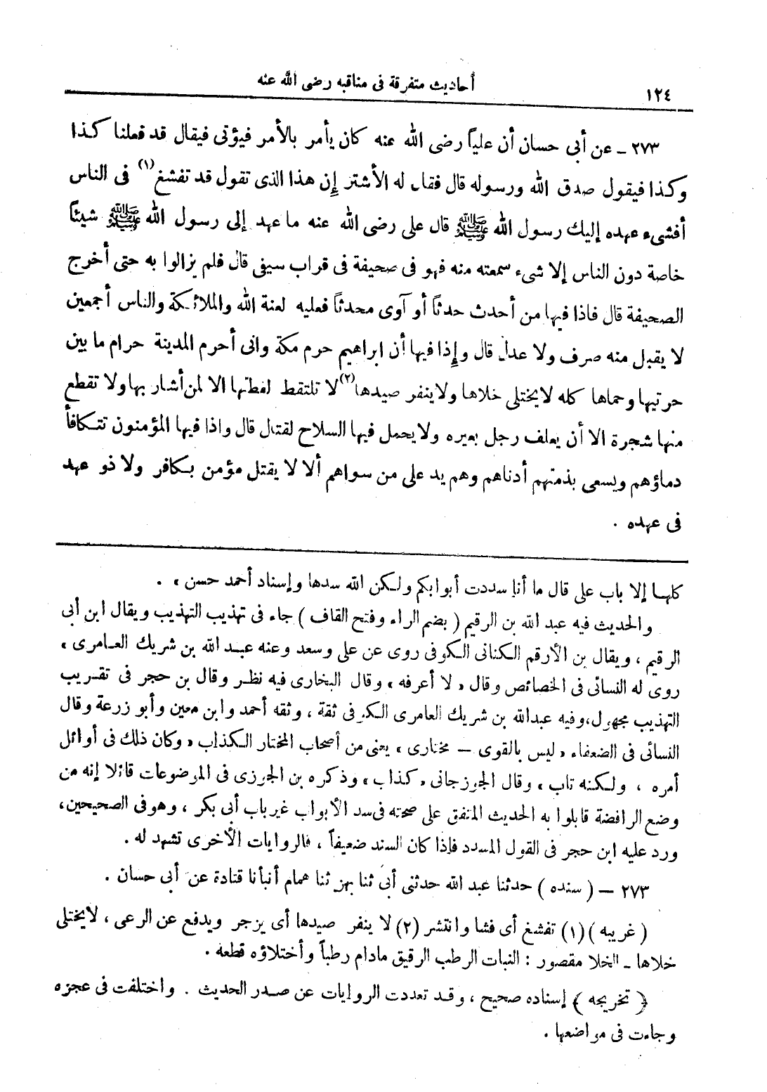 273 - عن أبي حسان أن ليًا رضي الله عنه كان يأمر بالأمر فيؤتى فيقال قد فعلنا كذا وكذا فيقول صدق الله ورسوله قال فقال له الأشتر إن هذا الذى تقول قد تفشغ (1) فى الناس أفشئ عهده إليك رسول الله صلى الله عليه وسلم قال على رضي الله عنه ما عهد إلى رسول الله صلى الله عليه وسلم قال على رضي الله عنه ما عهد إلى رسول الله صلى الله عليه وسلم شيئاً خاصة دون الناس إلا شئ سمعته منه فهو فى صحيفة فى قراب سيفى قال فلم يزالوا به حتى أخرج الصحيفة قال فإذا فيها من أحداث حدثاً أو آوى محدثاً فعليه لعنة الله والملائكة والناس أجمعين لا يقبل منه صرف ولا عدل قال وإذا فيها أن إبراهيم حرم مكة وانى أحرم المدينة حرام ما بين حريتها وحماها كله لا يختلى خلاها ولا ينفر صيدها (2) لا تلقتط لفظتها إلا لمن أشار بها ولا تقطع منها شجرة إلا أن يعلف رجل بعيره ولا يحمل فيها السلاح لقتال قال وإذا فيها المؤمنون تتكافأ دماؤهم ويسعى بذمتهم أدناهم وهم يد على من سواهم ألا لا يتقل بكافر ولا ذو عهد في عهده.