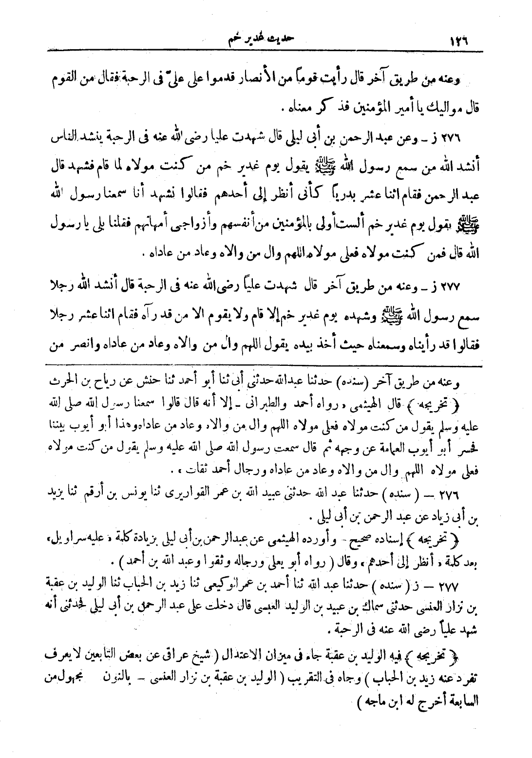 276 ز- وعن عبد الرحمن بن أبى ليلى قال شهدت عليا رضي الله عنه فى الرحبة ينشد الناس أنشد الله من سمع رسول الله صلى الله عليه وسلم يقول يوم غدير خم من كنت مولاه لما قام فشهد قال عبد الرحمن فقام اثنا عشر بدريًا كأنى أنظر إلى أحدهم فقالوا نشهد أنا سمعنا رسول الله صلى الله عليه وسلم يقول يوم غدير خم ألست أولى بالمؤمنين من أنفسهم وأزواجى أمهاتهم فقلنا بلى يا رسول الله قال فمن كنت مولاه فعلى مولاه اللهم واله من والاه وعاد من عاداه.