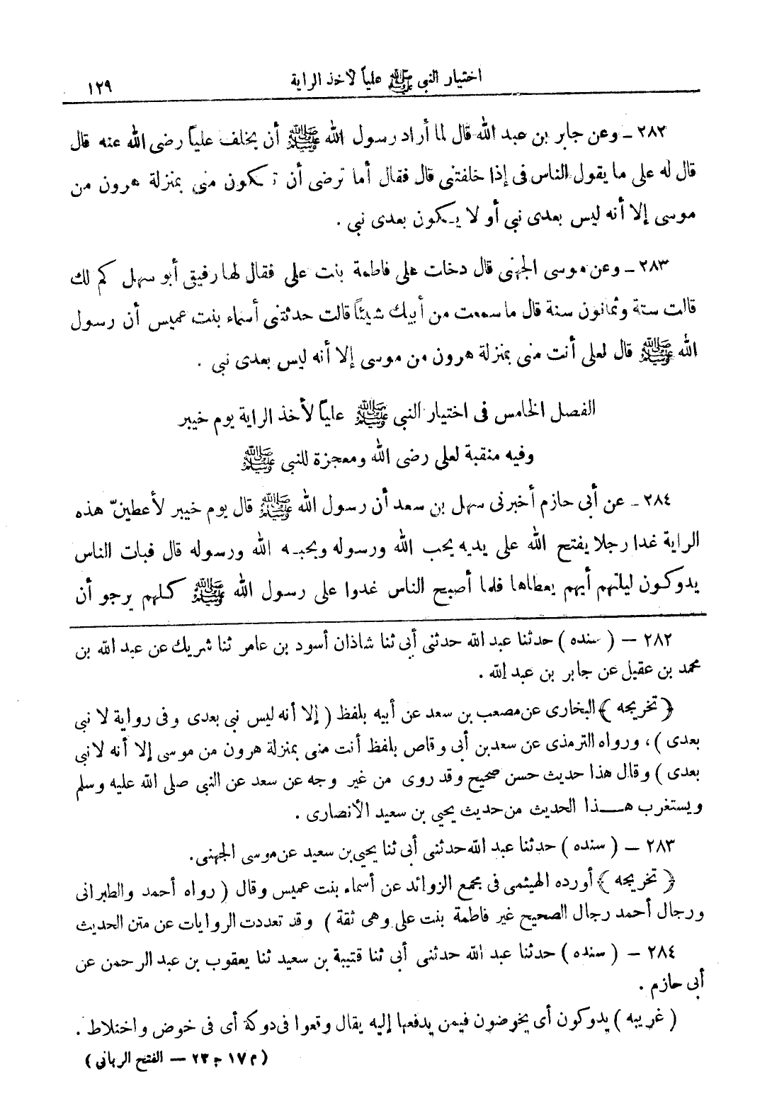 (تخريجه) البخارى عن مصعب بن سعد عن أبيه بلفظ (إلا أنه ليس نبى بعدى وفى رواية لا نبى بعدى)، ورواه الترمذى عن سعد بن أبى وقاص بلفظ أنت منى بمنزلة هرون من موسى إلا أنه لا نبى بعدى) وقال هذا حديث حسن صحيح وقد روى من غير وجه عن سعد عن النبى صلى الله عليه وسلم ويستغرب هذا الحديث من حديث يحيى بن سعيد الأنصارى.
