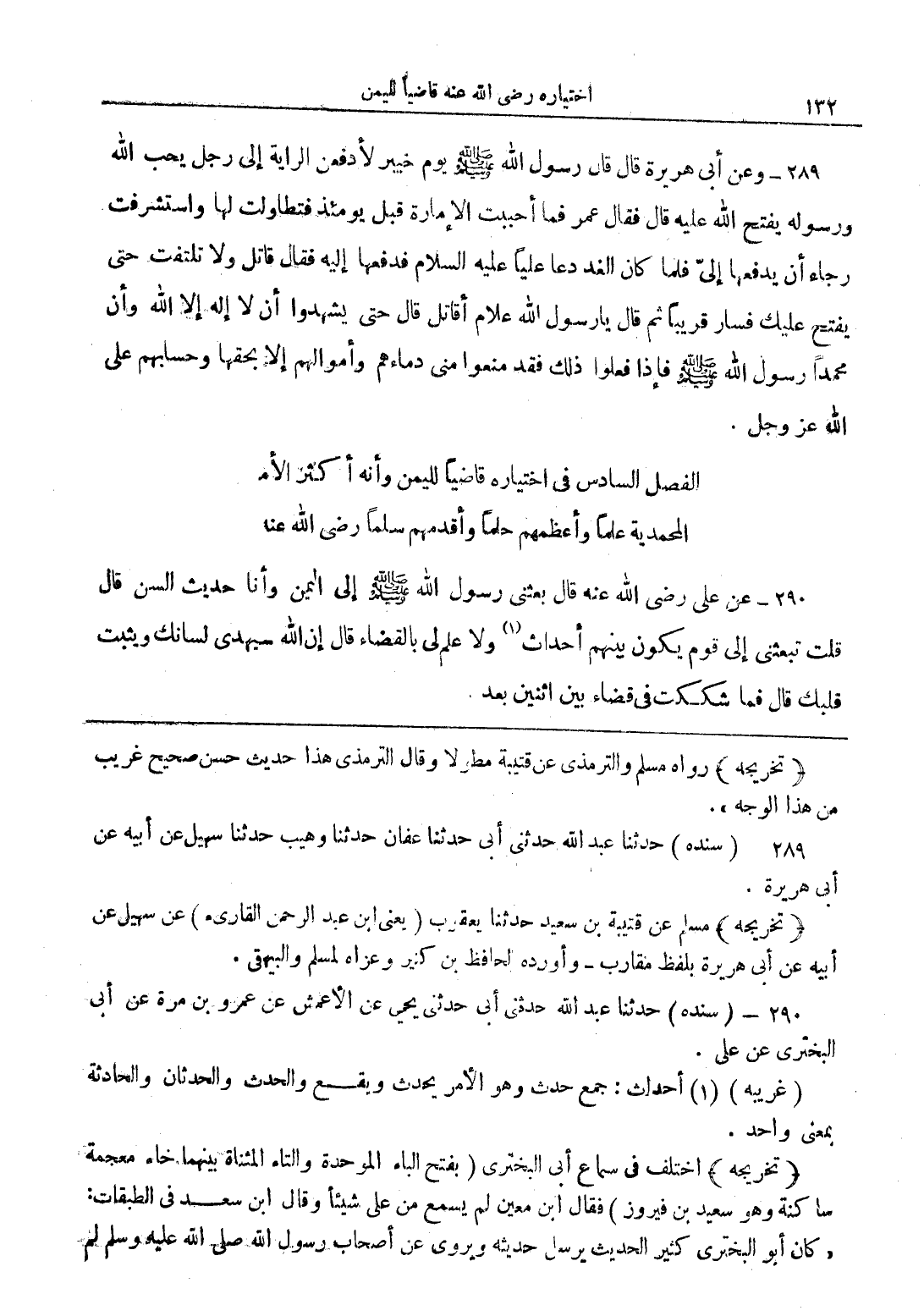 289 - وعن أبي هريرة قال قال رسول الله صلى الله عليه وسلم يوم خيبر لأدفعن الراية إلى رجل يحب الله ورسوله يفتح الله عليه قال فقال عمر فما أحببت الإمارة قبل يومئذ فتطاولت لها واستشرفت رجاء أن يدفعها إلىّ فلما كان الغد دعا عليًا عليه السلام فدفعها إليه فقال قاتل ولا تلتفت حتى يفتح عليك فسار قريباً ثم قال يا رسول الله علام أقاتل قال حتى يشهدوا أن لا إله إلا الله وأن محمداً رسول الله صلى الله عليه وسلم فإذا فعلوا ذلك فقد منعوا منى دماءهم وأموالهم إلا بحقها وحسابهم على الله عز وجل.