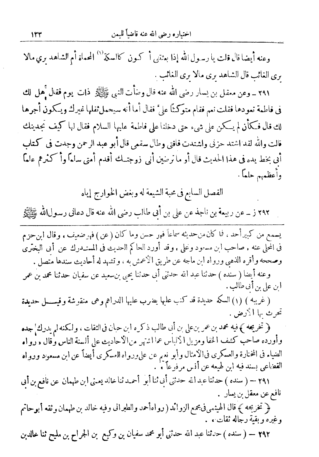 291 - وعن معقل بن يسار صلى الله عليه وسلم قال وضأت النبى صلى الله عليه وسلم ذات يوم فقال هل لك فى فاطمة تعودها فقلت نعم فقام متوكئاً علىَّ فقال أما أنه سيحمل ثقلها غيرك ويكون أجرها لك قال فكأن لم يكن على شئ حتى دخلنا على فاطمة عليها السلام فقال لها كيف نجدينك قالت والله لقد اشتد حزنى واشتدت فاقتى وطال سقمى قال أبو عبد الرحمن وجدت فى كتاب أبى بخط يده فى خذا الحديث قال أو ما ترضين أنى زوجتك أقدم أمتى سلماً وأكثرهم علماً وأعظمهم حلماً.