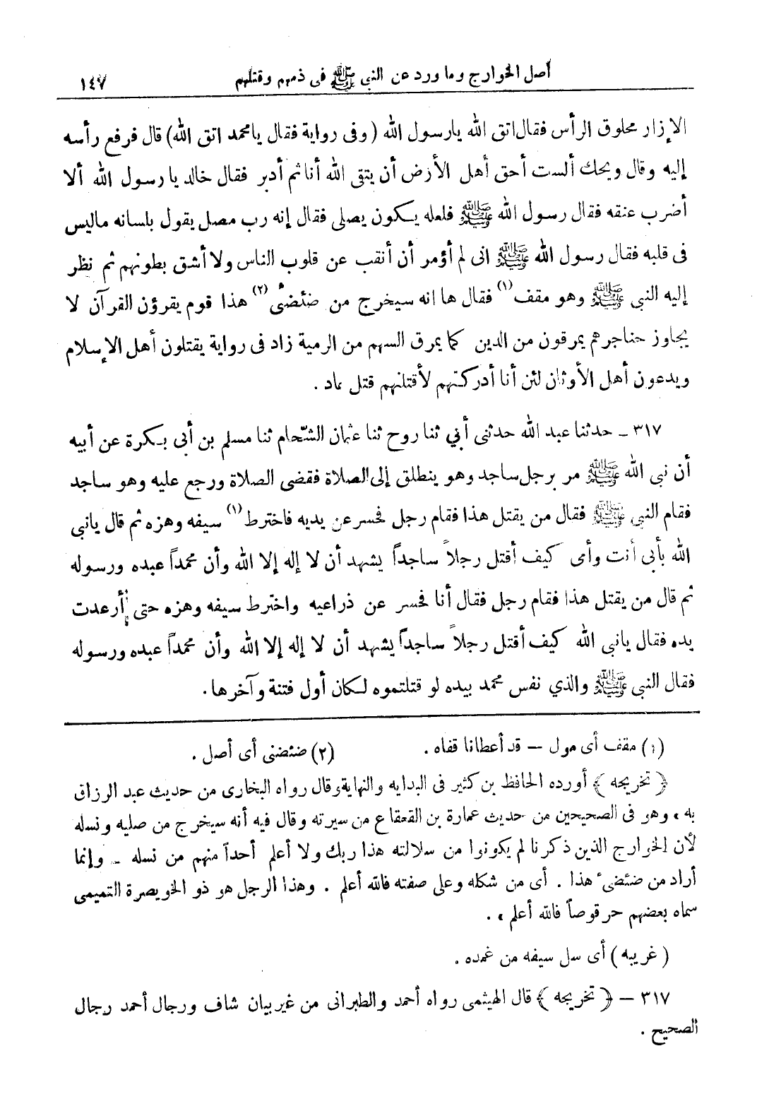 317 - حدثنا عبد الله حدثنى أبى ثنا روح ثنا عثمان الشّحام ثنا مسلم بن أبى بكرة عن أبيه أن نبى الله صلى الله عليه وسلم مر برجل ساجد وهو ينطلق إلى الصلاة فقضى الصلاة ورجع عليه وهو ساجد فقام النبى صلى الله عليه وسلم فقال من يقتل هعذا فقام رجل فحسر عن يديه فاخترط (1) سيفه وهزه ثم قال يا نبى الله بأبى أنت وأمى كيف أقتل رجلاً ساجداً يشهد أن لا إله إلا الله وأن محمداً عبده ورسوله ثم قال من يقتل هذا فقام رجل فقال أنا فحسر عن ذراعيه واخترط سيفه وهزه حتى أردعت يده فقال يا نبى الله كيف أقتل رجلاً ساجداً يشهد أن لا إله إلا الله وأن محمدًا عبده ورسوله ثم قال يا نبى الله كيف أقتل رجلاً ساجدًا يشهد أن لا إله إلا الله وأن محمدًا عبده ورسوله فقال النبى صلى الله عليه وسلم فقال النبى صلى الله عليه وسلم والذي نفس محمد بيده لو قتلتموه لكان أول فتنة لكان أول فتنة وآخرها.