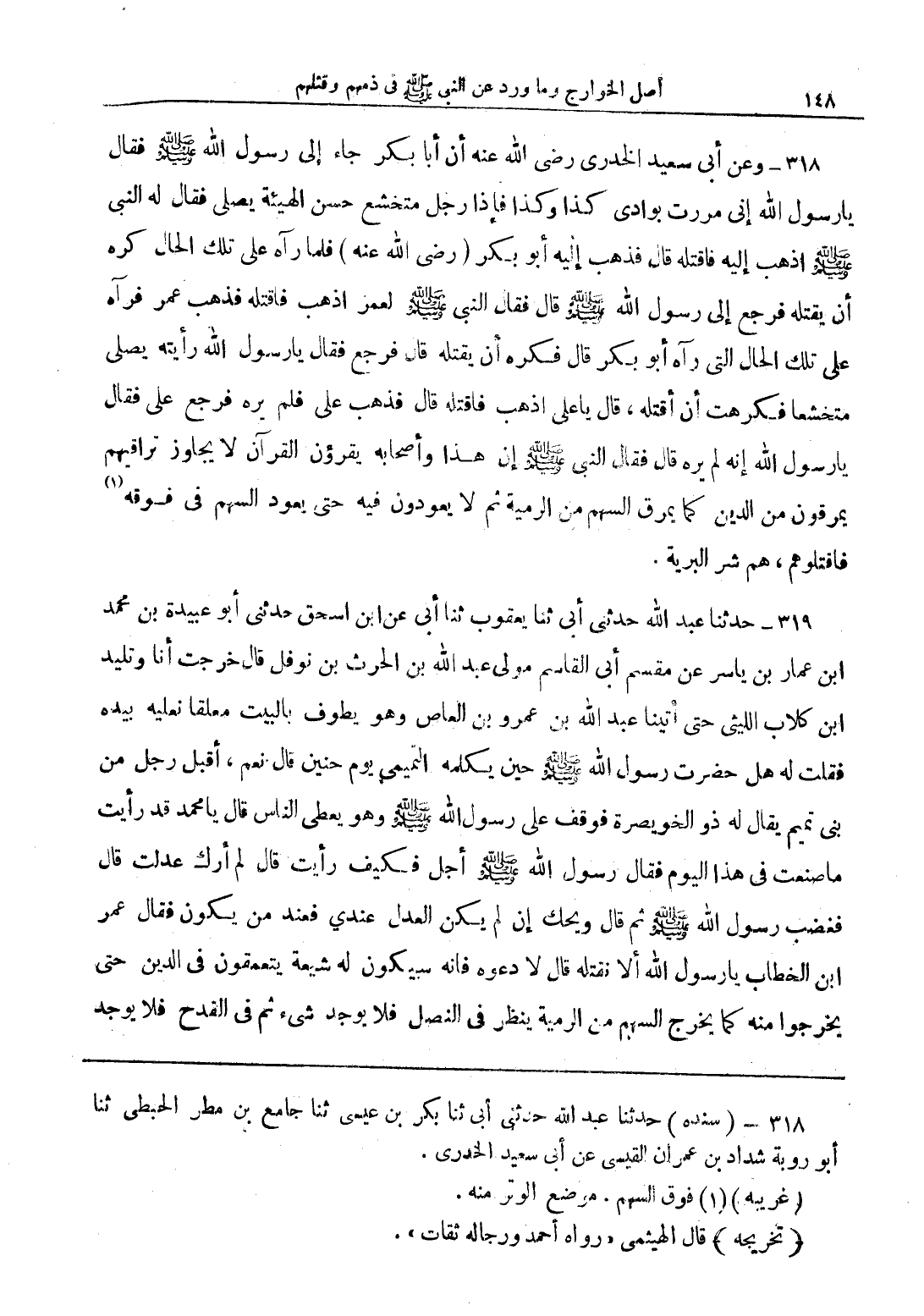 318 - وعن أبي سعيد الخدرى رضي الله عنه أن أبا بكر جاء إلى رسول الله صلى الله عليه وسلم فقال يا رسو الله إنى مررت بوادى كذا وكذا فإذا رجل متخشع حسن الهيئة يصلى فقال له النبى صلى الله عليه وسلم اذهب إليه فاقتله قال فذهب إليه أبو بكر (رضي الله عنه) فلما رآه على تلك الحال كره أن يقتله فرجع إلى رسول الله صلى الله عليه وسلم قال فقال النبى صلى الله عليه وسلم لعمر اذهب فاقتله فذهب عمر فرآه على تلم الحال التى رآه أبو بكر قال فكره أن يقتله قال فرجع فقال يا رسول الله رأيته يصرى متخشعا فكرهت أن أتقله، قال يا على اذهب فاقتله قال فذهب على فلم يره فرجع على فقال يا رسول الله إنه لم يره قال فقال النبى صلى الله عليه وسلم إن هذا وأصحابه يقرؤن القرآن لا يجاوز تراقبهم يمرقون من الدين كما يمرق السهم من الرمية ثم لا يعودون فيه حتى يعود السهم فى فقوه (1) فاقتلوهم، هم شر البرية.