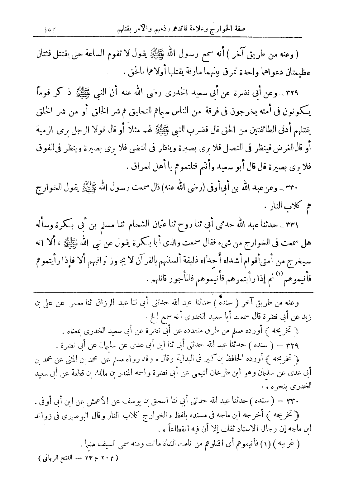 330 - وعن عبد الله بن أبى أوفى (رضي الله عنه) قال سمعت رسول الله صلى الله عليه وسلم يقول الخوارج هم كلاب النار.
