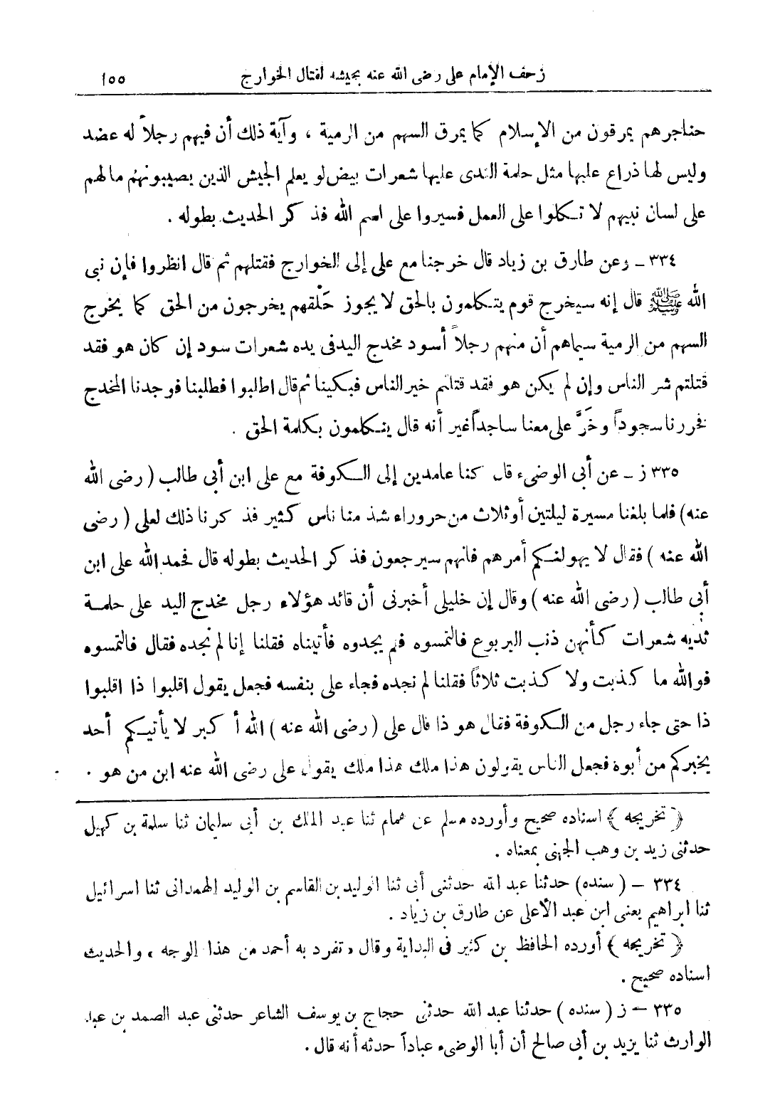 334 - وعن طارق بن زياد قال خرجنا مع على إلى الخوارج فقتلهم ثم قال انظروا فإن نبى الله صلى الله عليه وسلم قال إنه سيخرج قوم يتكلمون بالحق لا يجوز حلقهم يخرجون من الحق كما يخرج السهم من الرمية سيماهم أن منهم رجلاً أسود مخدج اليد فى يبده شعرات سود إن كان هو فقد قتلتم شر الناس وإن لم يكن هو فقد قتلتم خير الناس فبكينا ثم قال اطلبوا فطلبنا فوجدنا المخدج فحررنا سجوداً وخرَّ على معنا ساجداً غير أنه قال يتكلمون بكلمة الحق.