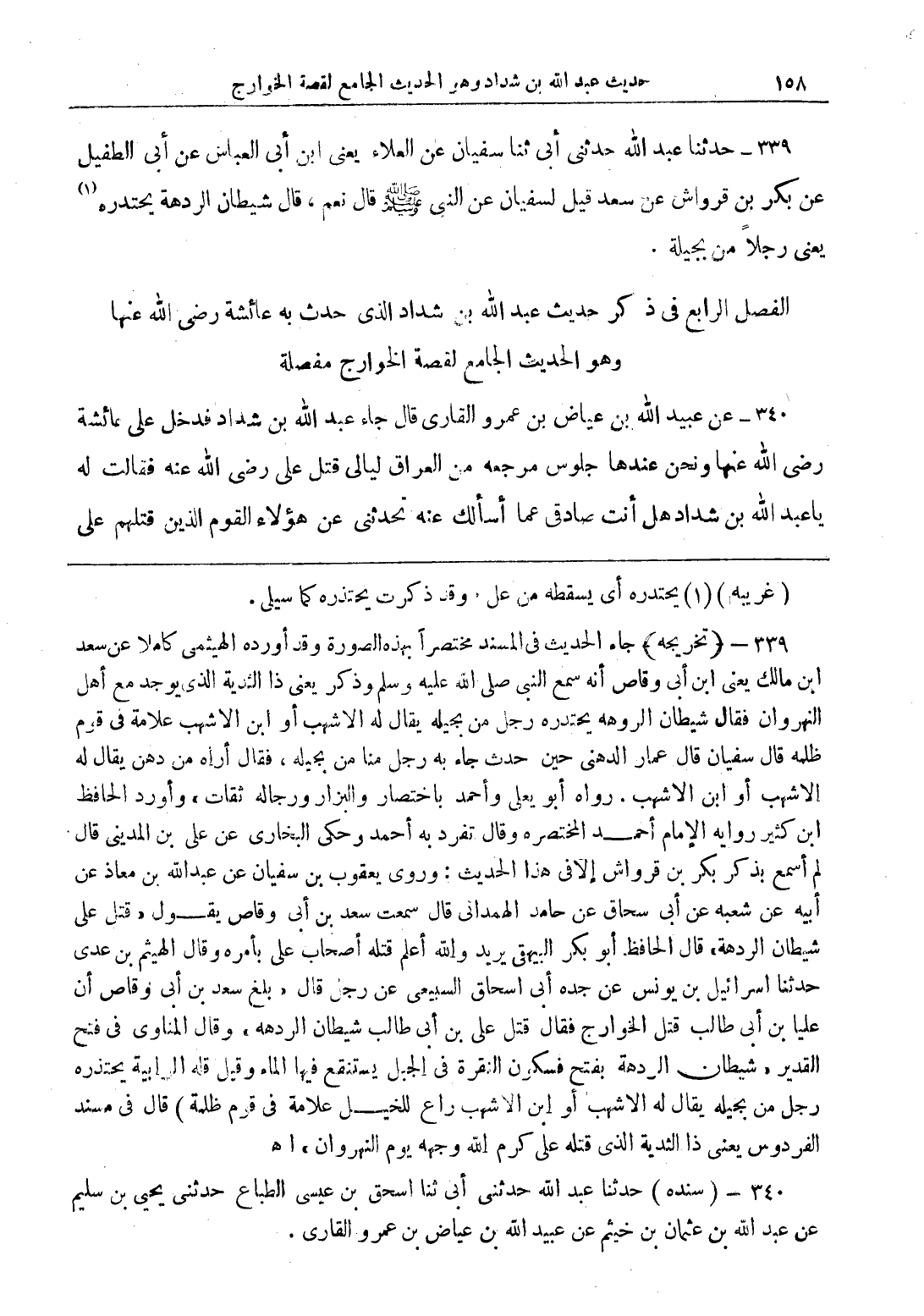 339 - (تخريجه) جاء الحديث فى المسند مختصراً بهذه الصورة وقد أورده الهيثمى كاملا عن سعد ابن مالك يعنى ابن أبى وقاص انه سمع النبى صلى الله عليه وسلم وذكر يعنى ذا الثدية الذى يوجد مع أهل النهروان فقال شيطان الروهه يحتدره رجل من بجيله يقال له الاشهب أو ابن الاشهب علامة فى قوم ظلمه قال سفيان قال عمار الدهنى حين حدث جاء به رجل منا من يجيله، فقال أراه من دهن يقال له الاشهب أو ابن الاشهب. رواه أبو يعلى وأحمد باختصار والبزار ورجاله ثقات" وأورد الحافظ ابن كثير رواية الإمام احمد المختصرة وقال تفرد به أحمد وحكى البخارى عن على بن المدينى قال لم أسمع عن شعبه عن أبى سحاق عن حامد الهمدانى قال سمعت سعد بن أبى وقاص يقول "قتل على شيطان الردهة" قال الحافظ أبو بطر البيهقى يريد والله أعلم قتله أصحاب على بأمره وقال الهيثم بن عدى حدثنا اسرائيل بن يونس عن جده أبى اسحاق السبيعى عن رجل قال "بلغ سعد بن أبى وقاص أن عليا ابن أبى طالب قتل الخوارج فقال قتل على بن أبى طالب شيطان الردهة" وقال المناوى فى فتح القدير "شيطان الردهة بفتح فسكون النقرة فىلجبل يستنقع فيها الماء وقيل قله الرابية يحتذره رجل من بجيله يقال له الاشهب او ابن الاشهب راع للخيل علامة فى قوم ظلمة) قال فى مسند الفردوس يعنى ذا الثدية الذى قتله على كرم الله وجهه يوم النهروان" أهـ