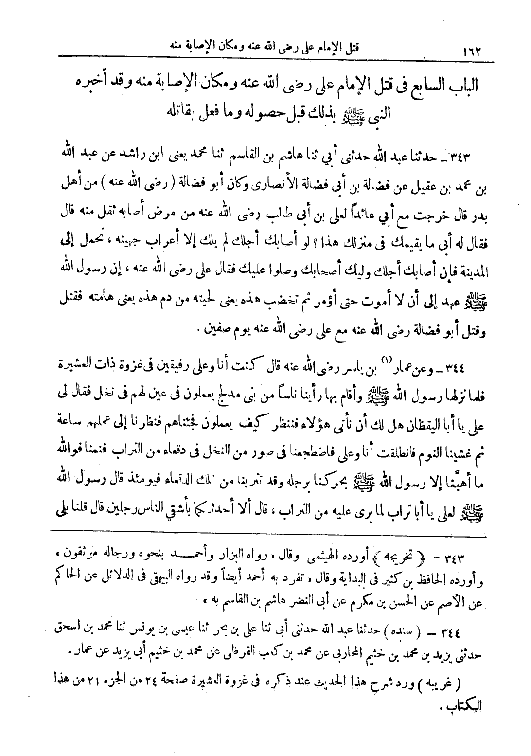 343 - حدثنا عبد الله حدثنى أبي ثنا هاشم بن القاسم ثنا محمد يعنى ابن راشد عن عبد الله بن محمد بن عقيل عن فضالة بن أبى عائداً لعلى بن أبى طالب رضي الله عنه من مرض أصابه ثقل منه قال فقال له أبى ما يقيمك فى منزلك هذا؟ لو أصابك أجلك لم يلك إلا أعراب جهينه، تحمل إلى المدينة فإن أصابك أجلك وليك أصحابك وصلوا عليك فقال على رضي الله عنه، إن رسول الله صلى الله عليه وسلم عهد إلى أن لا أموت حتى أؤمر ثم تخضب هذه يعنى لحيته من دم هذه يعنى هامته فقتل وقلت أبو فضالة رضي الله عنه مع على رضي الله عنه يوم صفين.