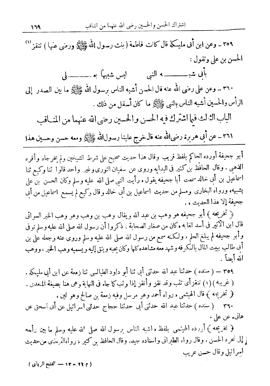 (تخريجه) أورده الهيثمى بلفظ "اشبه الناس برسول الله صلى الله عليه وسلم ما بين رأسه إلى نحره الحسن، وقال رواه الطبرانى واسناده جيد، وقال الحافظ بن كثير "رواه الترمذى من حديث اسرائيل وقال حسن عريب