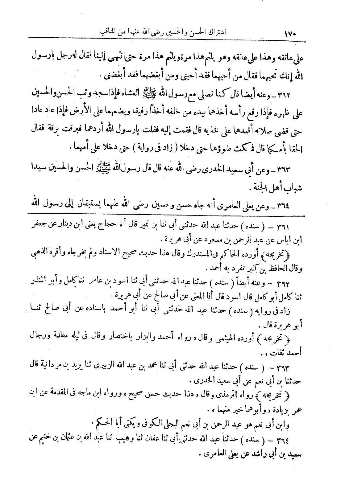363 - وعن أبى سعيد الخدرى رضي الله عنه قال قال رسول الله صلى الله عليه وسلم الحسن والحسين سيدا شباب أهل الجنة.