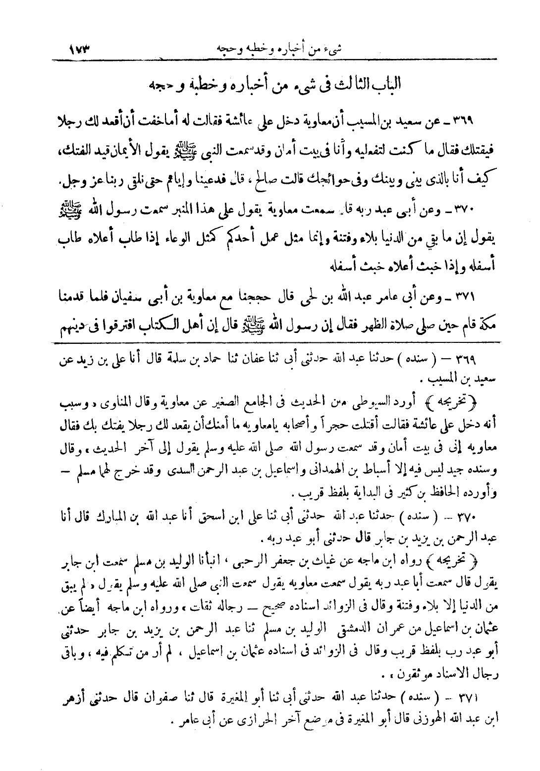 369 - عن سعيد بن المسيب أن معاوية دخل على عائشة فقالت له أما خفت أن أقعد لك رجلاً فيقتلك فقال ما كنت لتفعليه وأنا في بيت أمان وقد سمعت النبي (صلى الله عليه وسلم) يقول الإيمان قيد الفتك، كيف أنا بالذي بيني وبينك وفي حوائجك قالت صالح، قال فدعينا وإياهم حتى نلقي ربنا عز وجل.