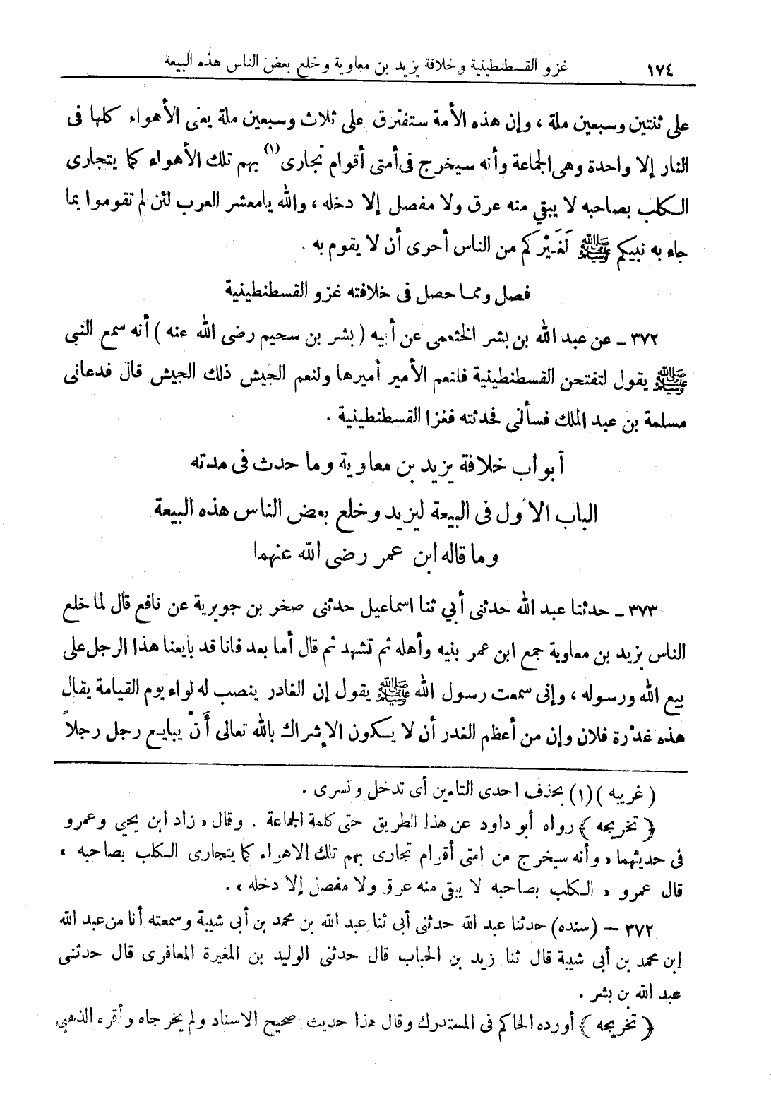 372 - عن عبد الله بن بشر الخثعمي عن أبيه (بشر بن سحيم رضي الله عنه) أنه سمع النبي (صلى الله عليه وسلم) يقول لتفتحن القسطنيطينية فلنعم الأمير أميرها ولنعم الجيش ذلك الجيش قال فدعاني مسلمة بن عبد الملك فسألني فحدثه فغزا القسطنطينية.