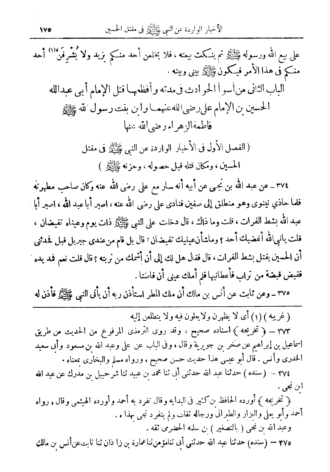 374 - عن عبد الله بن نجي عن أبيه أنه سار مع على رضي الله عنه وكان صاحب مطهرته فلما حاذي نينوي وهو منطلق إلى صفين فنادي على رضي الله، أصبر أبا عبد الله، أصبر أبا عبد الله بشط الفرات، قلت وما ذاك، قال دخلت على النبي (صلى الله عليه وسلم) ذات يوم وعيناه تفضيان، قلت يا نبي الله أغضبك أحد؟ وما شأن عينيك تفضيان؟ قال بل قام من عندي جبريل قبل فحدثني أن الحسين يقتل بشط الفرات، قال فقال هل لك إلى أن أشمك من تربته؟ قال قلت نعم فمد يده فقبض قبضة من تراب فأعطانيها لم أملك عيني أنا فاضتا.