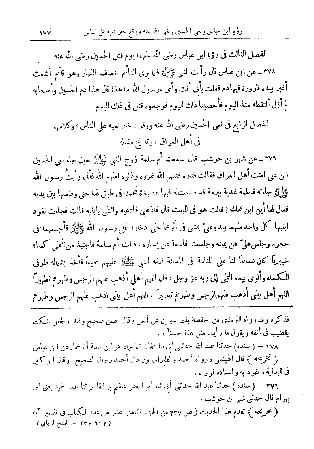 378 - عن ابن عباس قال رأيت النبي (صلى الله عليه وسلم) فيما يري النائم بنصف النهار وهو قائم أشعث أغبر بيده قاروروة فيها دم فقلت بأبي أنت وأمي يا رسول الله ما هذا قال هذا دم الحسين وأصحابه لم أزل التقطه منذ اليوم فأحصينا ذلك اليوم فوجوده قتل في ذلك اليوم.