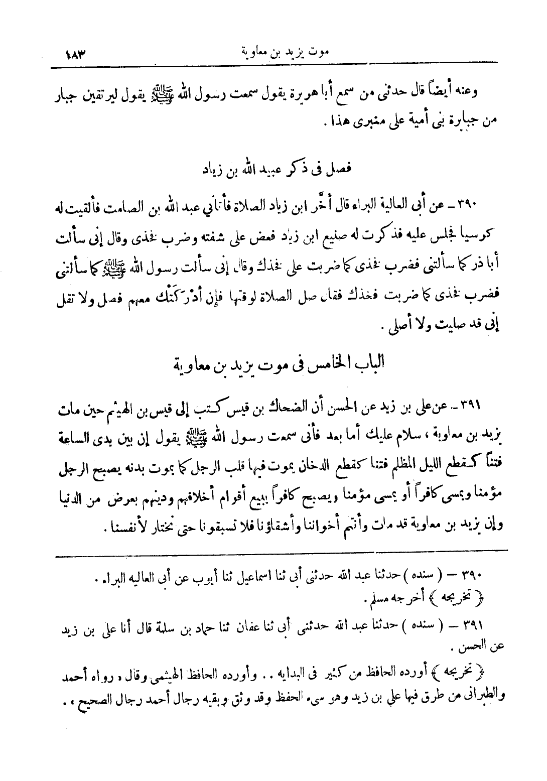 390 - عن أبي العالية البراء قال أخَّر ابن زياد الصلاة فأتاني عبد الله بن الصامت فألقيت له كرسيًا فجلس عليه فذكرت له صنيع ابن زياد فعض على شفته وضرب فخدي وقال إني سألت أبا ذر كما سألتني فضرب فخدي كما ضربت على فخدك وقال إني سألت رسول الله (صلى الله عليه وسلم) كما سألتني فضرب فخدي كما ضربت فخذك فقال صل الصلاة لوقتها فغن أدركتك معهم فصل ولا تقل إني قد صليت ولا أصلى.