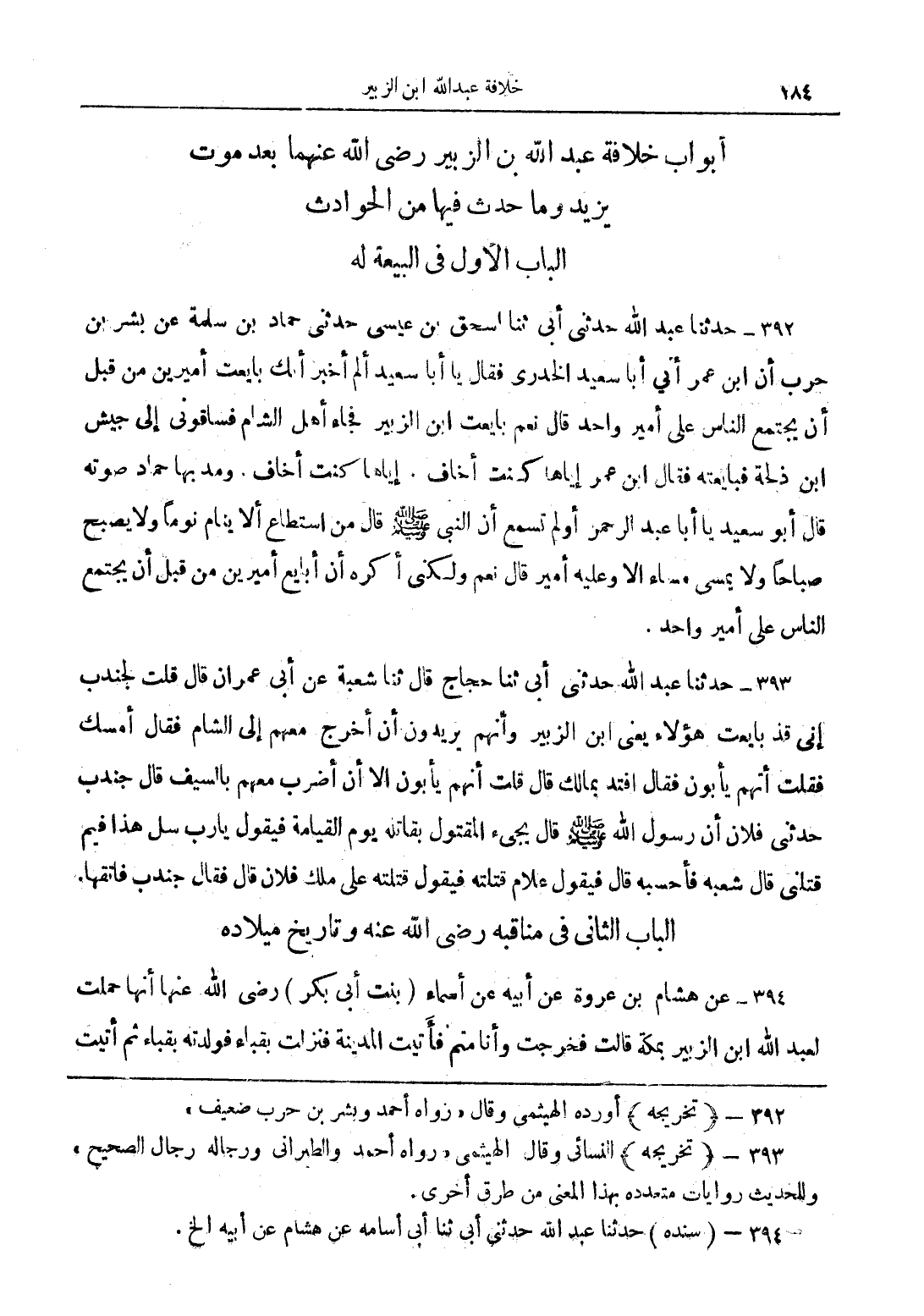 392 - حدثنا عبد الله حدثني أبى ثنا إسحاق بن عيسي حدثني حماد بن سلمة عن بشر بن حرب أن أبن عمراني أبا سعيد الخدري فقال يا أبا سعيد ألم أخبر أنك بايعت أميرين من قبل أن يجتمع الناس على أمير واحد قال نعم بايعت ابن الزبير فجاء أهل الشام فساقوني إلى جيش ابن ذلجة فبايعته فقال ابن عمر إياها كنت أخاف، إياها كنت أخاف، ومد بها حماد صوته قال أبو سعيد يا أبا عبد الرحمن أو لم تسمع أن النبي (صلى الله عليه وسلم) قال من استطاع ألا ينام نومًا ولا يصبح صباحًا ولا يمسي مساء إلا وعليه أمير قال نعم ولكني أكره أن أبليغ أميرين من قبل أن يجتمع الناس على أمير واحد.