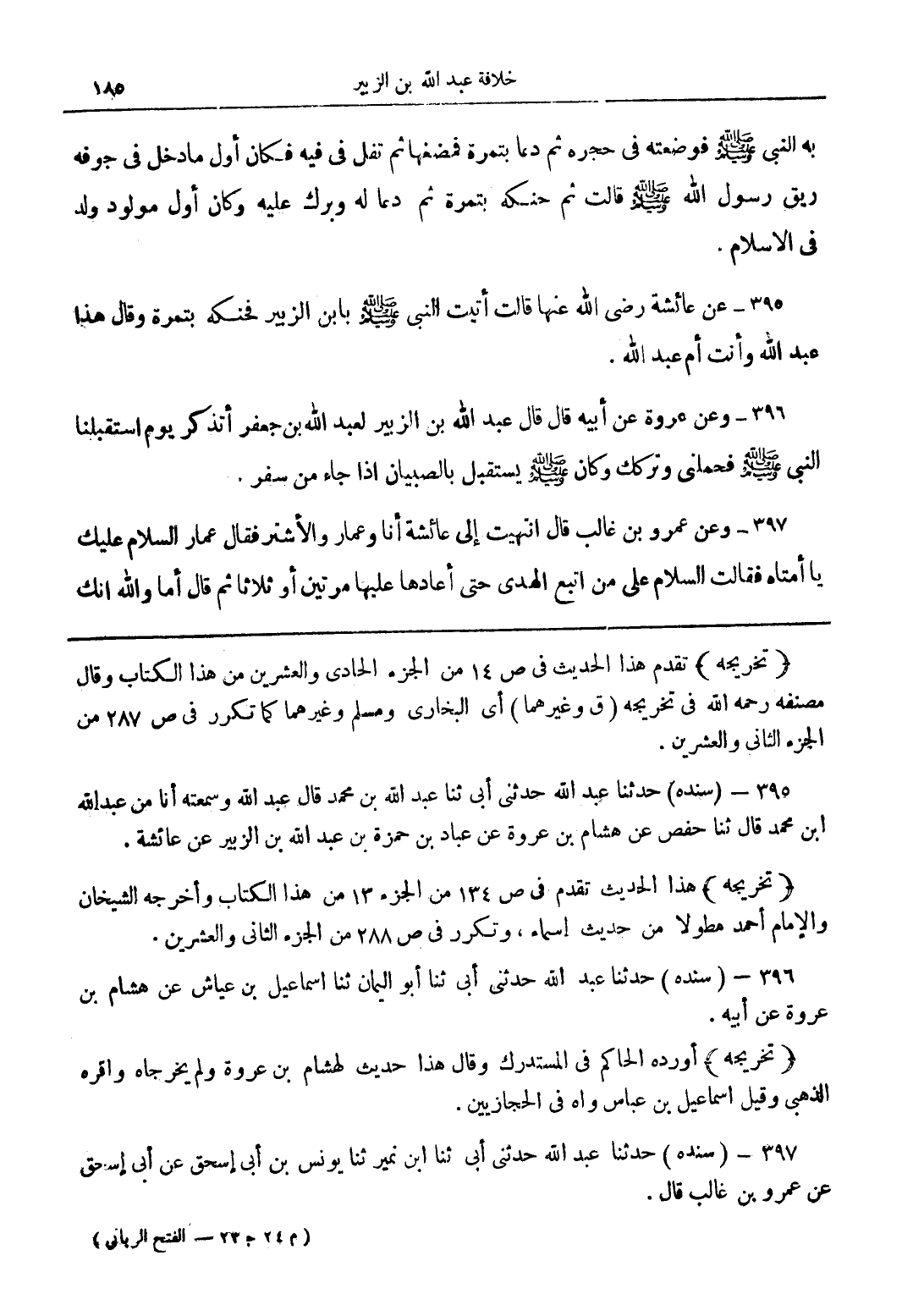 395 - عن عائشة رضي الله عنها قالت أتيت النبي (صلى الله عليه وسلم) بابن الزبير فحنكه بتمرة وقال هذا عبد الله وأنت أم عبد الله.