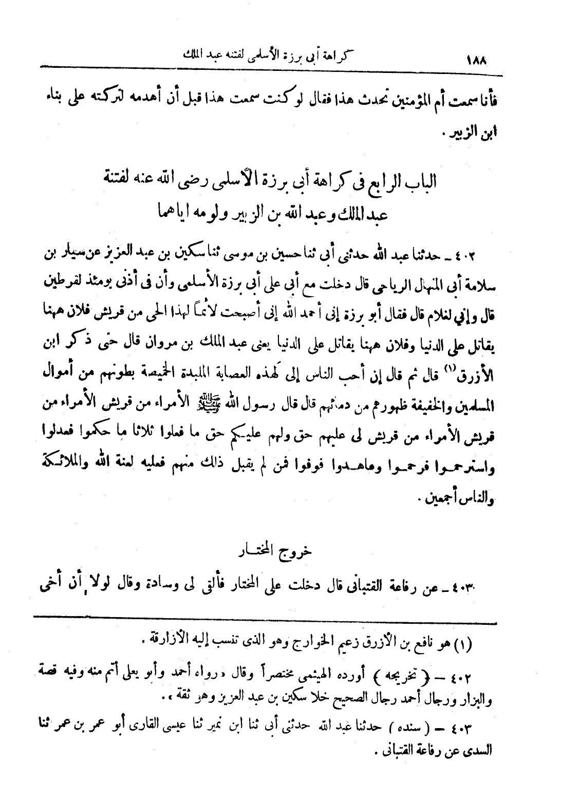 402 - حدثنا عبد الله حدثني أبى ثنا حسين بن موسي ثنا سكين بن عبد العزيز بن سيار بن سلامة أبى المنهال الرباحي قال دخلت مع أبى على أبى برزة الأسلمي وأنا في أذني يومئذ لقرطين قال وإني لغلام قال فقال أبو برزة إني أحمد الله إني أصبحت لائمًا لهذا الحي من قريش فلان ههنا يقاتل على الدنيا وفلان ههنا يقاتل على الدنيا يعني عبد الملك بن مروان قال حتى ذكر ابن الأزرق (1)، قال ثم قال إن أحب الناس إلى لهذه العصابة الملبدة الخميصة بطونهم من أموال المسلمين والخفيفة ظهورهم من دمائهم قال قال رسول الله (صلى الله عليه وسلم) الأمراء من قريش الأمراء من قريش الأمراء من قريش لي عليهم حق ولهم عليكم حق ما فعلوا ثلاثًا ما حكموا فعدلوا واسترحموا فرحموا وما هدوا فوفوا فمن لمن يقبل ذلك منهم فعليه لعنة الله والملائكة والناس أجمعين.