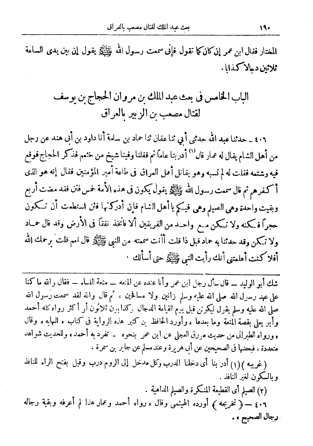 406 - حدثنا عبد الله حدثني أبى ثنا عفان ثنا حماد بن سلمة أنا داود بن أبى هند عن رجل من أهل الشام يقال له عمار قال (1) أدربنا علمًا ثم قفلنا فينا شيخ من خثعم فذكر الحجاج فوقع فيه وشتمه فقلت له لم تسبه وهو يقاتل أهل العراق في طاعة أمير المؤمنين فقال إنه هو الذي أكفرهم ثم قال سمعت رسول الله (صلى الله عليه وسلم) يقول يكون في هذه الأمة خمس فتن فقد مضت أربع وبقيت واحدة وهي الصليم وهي فيكم يا أهل الشام فإن أدركتها فئن استطعت أن تكون حجرًا فكنه ولا تكن مع واحد من الفريقين ألا فاتخذ نفقًا في الأرض وقد قال حماد ولا تكن وقد حدثنا به قبل ذا قلت أأنت سمعت من النبي (صلى الله عليه وسلم) قال نعم قلت يرحمك الله أفلا كنت أعلمتني أنك رأيت النبي (صلى الله عليه وسلم) حتى أسألك.