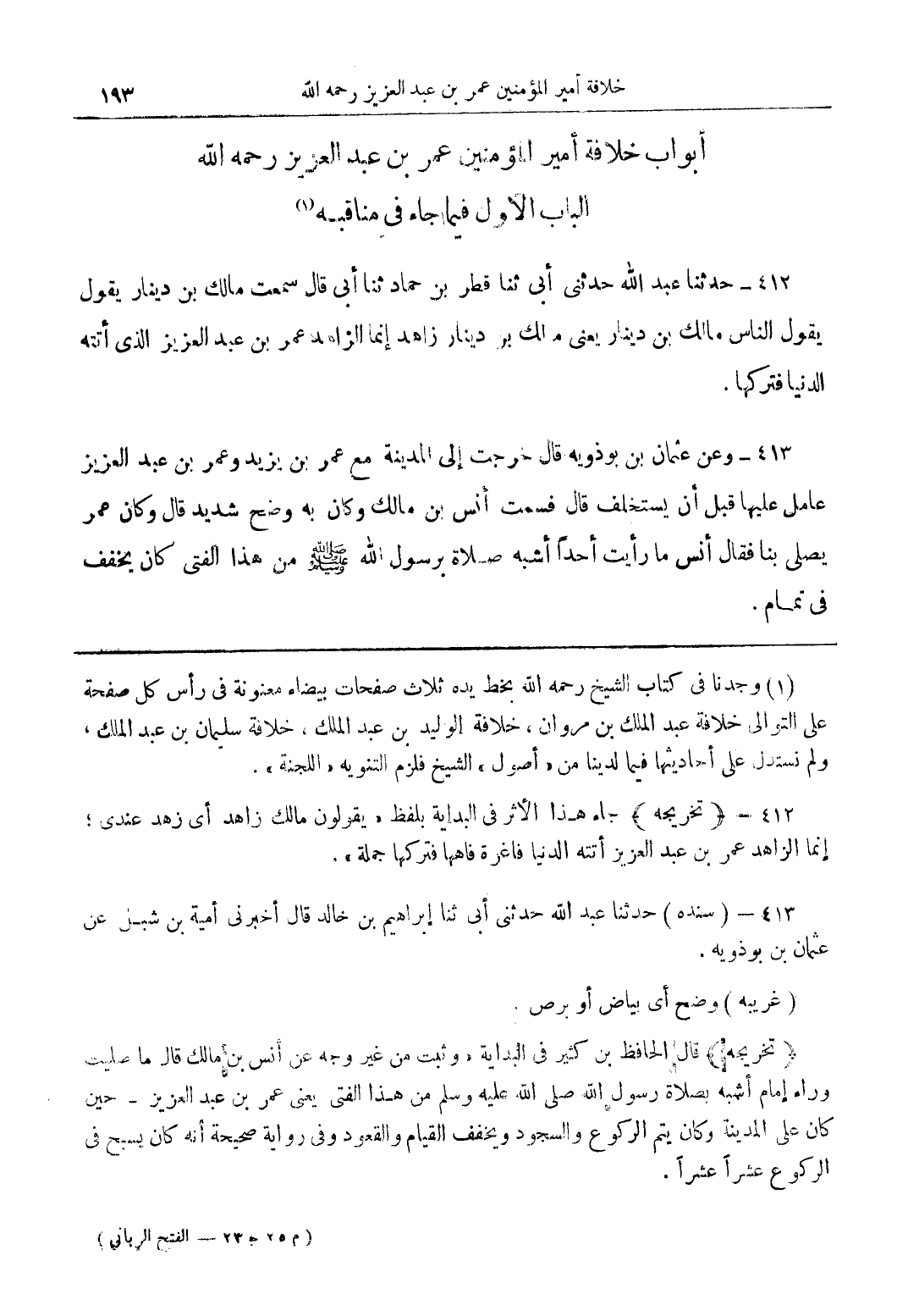 (1) وجدنا في كتاب الشيخ رحمه الله بخط يده ثلاث صفحات بيضاء معنونة في رأس كل صفحة على التوالي خلافة عبد الملك بن مروان، خلافة الوليد بن عبد الملك، خلافة سليمان بن عبد الملك، ولم تستدل على أحاديثها فيما لدينا من "أصول" الشيخ فلزم التنويه "اللجنة".